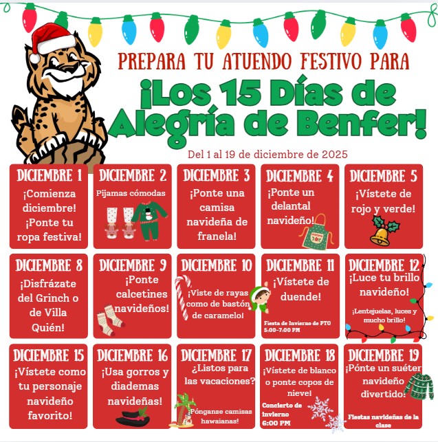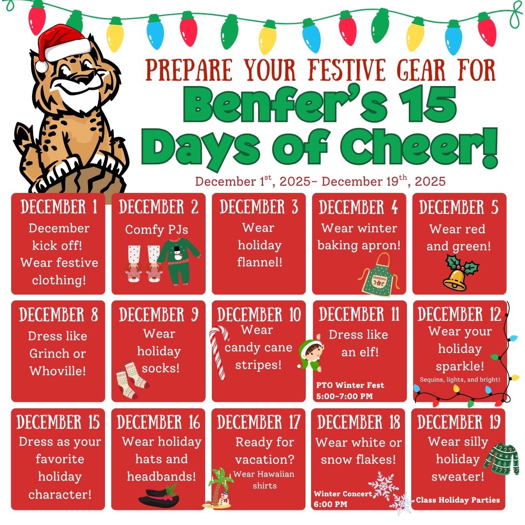 Monday, December 8th - Friday, December 12th: Holiday Shop Open Thursday, December 11th at 5:00 PM: Winter Fest Tuesday, December 16th at 5:00 - 8:00 PM: McDonald's Spirit Night Thursday, December 18th at 6:00 PM: Winter Concert for Benfer Beats and Choir Friday, December 19th at: Classroom Holiday Parties Monday, December 22nd - Wednesday, January 7th: Winter Break/ No School |