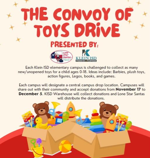 Bring new/unopened toys to the front office by December 5th for our Convoy of Toys Drive! |