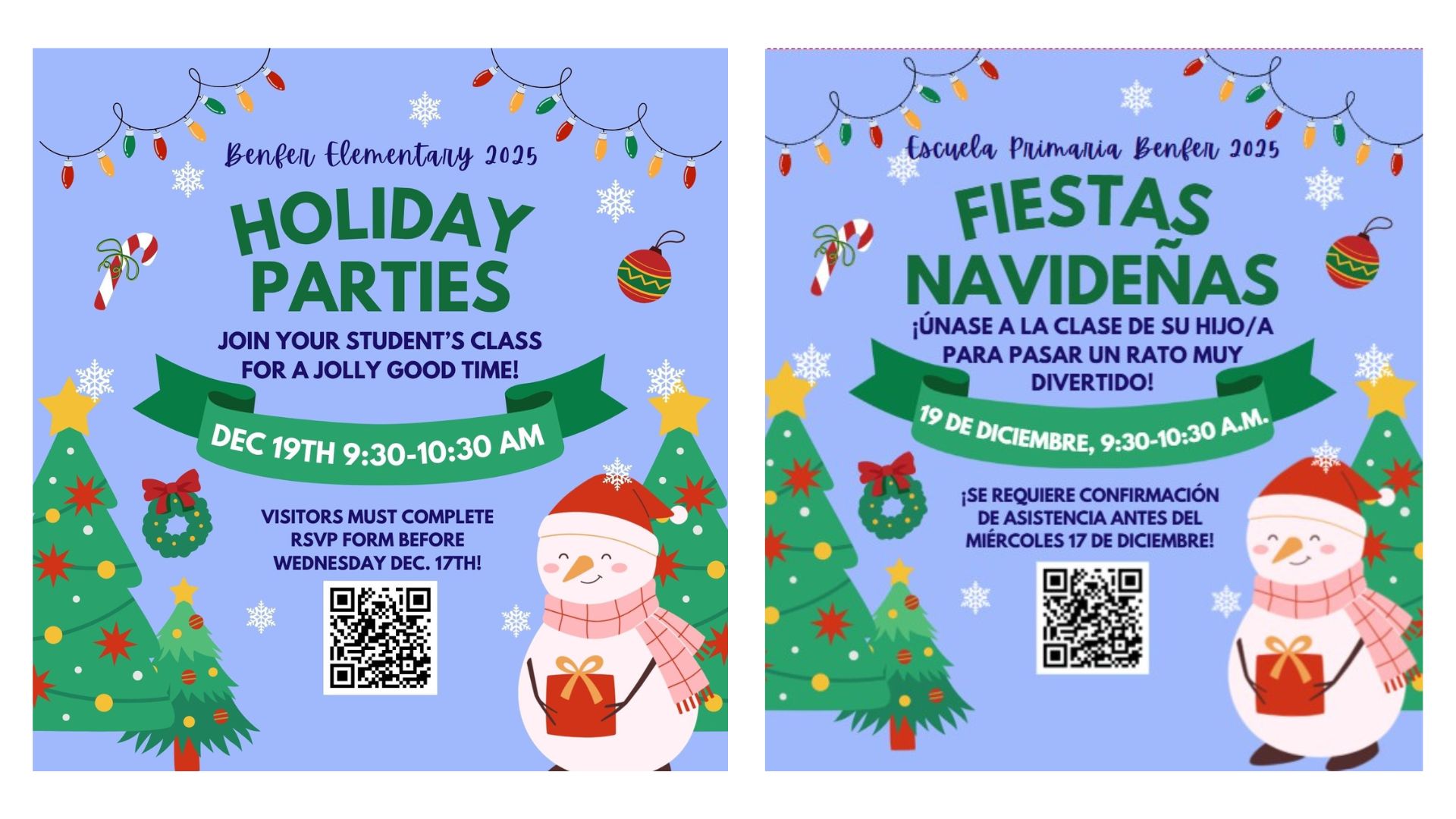 Any adult visitor must complete this RSVP form and have a receive a visitors badge from the front office in order to attend Benfer Classroom Holiday Parties. Holiday Parties will begin at 9:30 AM. Visitors may begin arriving at 9:15 AM to receive their badge.