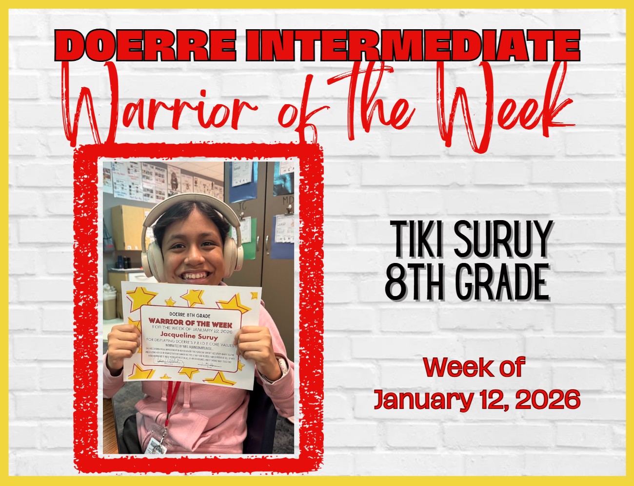 | Dear Doerre Families, I hope you and your family had a wonderful three-day weekend. This week will go by quickly, as we have only four days with students. There are no major updates to share—things are business as usual as we prepare for Spring Open House on January 27 and our 5th grade campus visits on January 28. It has been great to see so much positive learning and engagement happening in classrooms, and we appreciate your continued support.