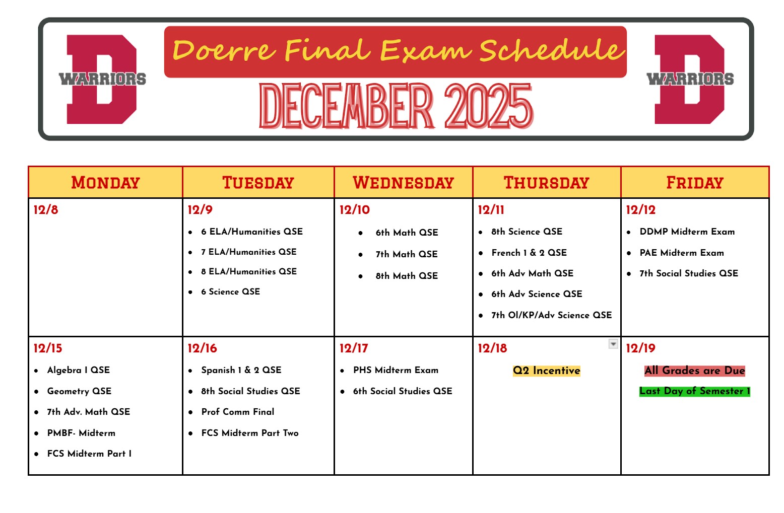 The end-of-semester exam schedule for QSE 2 and Midterm exams is now available. We do our best to ensure that no grade level has more than two exams in one day; however, due to the busy timing at the end of the semester, some overlap may occur. Please take a moment to review the schedule carefully, and don’t hesitate to reach out if you have any questions or concerns. |