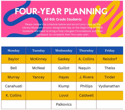 It’s that time of year when our 8th graders begin thinking about high school and their four-year plans! This week, our counseling team will meet with all 8th grade students during their PRIDE classes to begin building their four-year plan in Skyward.