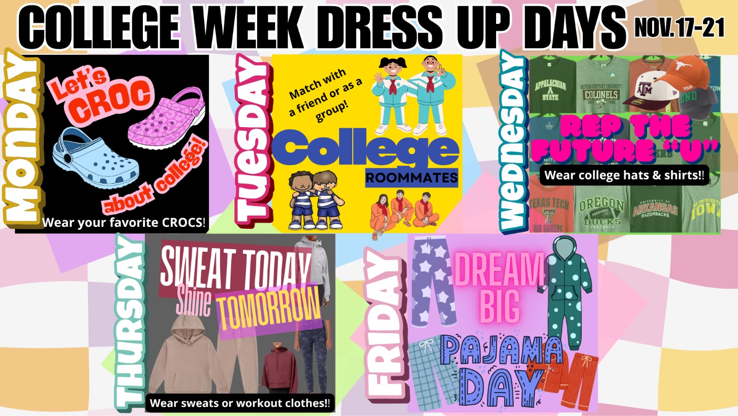 November 21- PRIDE Games Nov 17-21- Career Plan Core Class Entry Nov. 17-21- College Week Dress Up Week November 24-28- No School- Thanksgiving Week! |