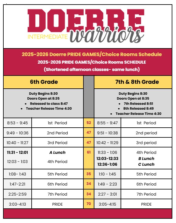 Supporting the Doerre PTO is one of the best ways to make a direct impact on our teachers and students! By joining, you help provide valuable resources, fund exciting events, and create opportunities that enrich the learning experience for all Warriors. Your membership helps ensure our teachers feel supported, our students are celebrated, and our campus community continues to thrive. Together, we can make a difference—join the Doerre PTO today! Join here: Doerre Intermediate School PTO - Klein ISD, TX - Membership