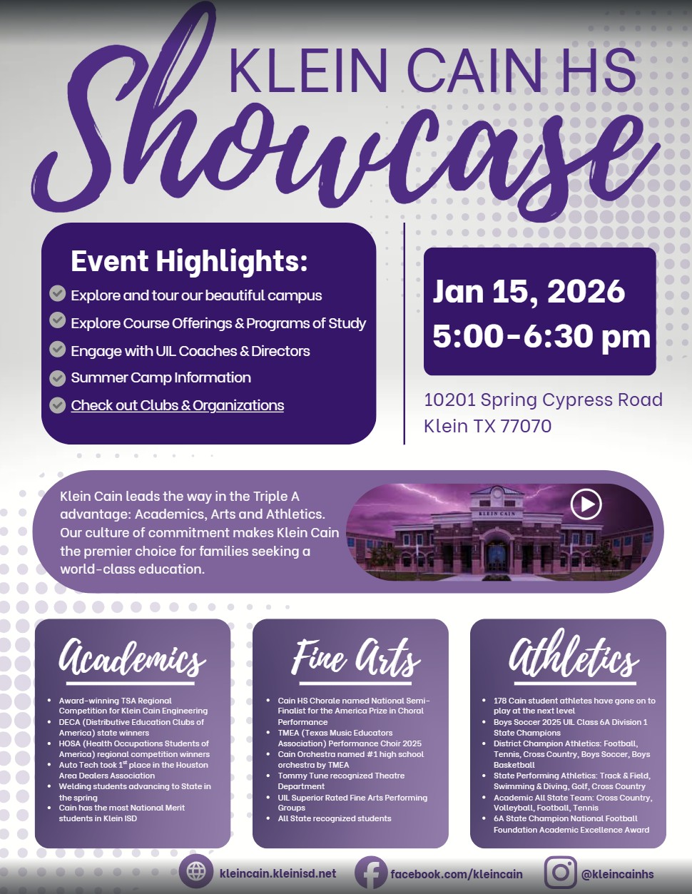 Wednesday, January 14th- Klein Cain FFA Interest Meeting Thursday, January 15th - Klein Cain Course Selection Showcase Thursday, January 22nd- Klein High Course Selection Showcase Course Selection Upcoming Events