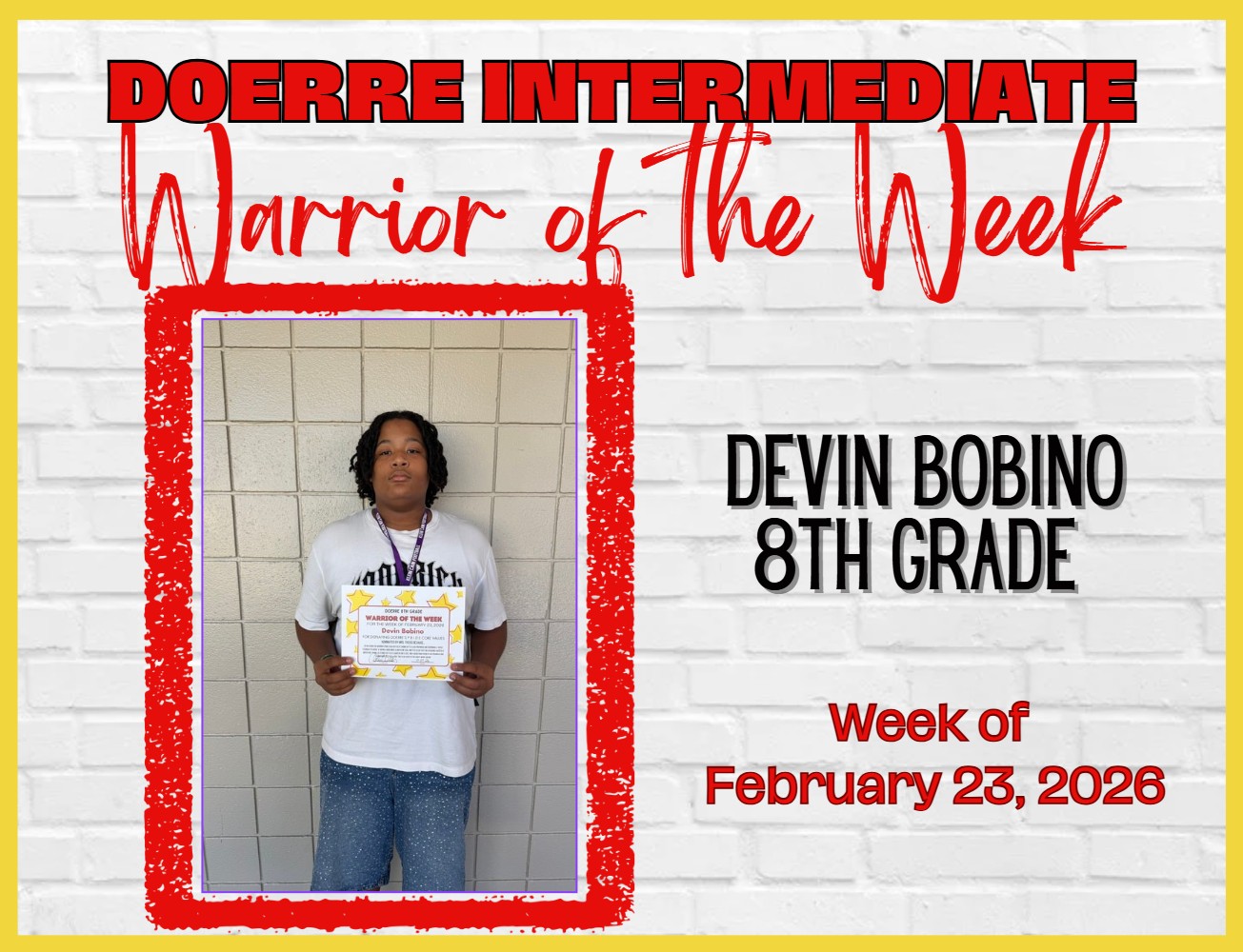 Thank you for being such an important part of the Doerre family. Let’s make it a great week! Annie Welday-Zimney Principal, Doerre Intermediate |