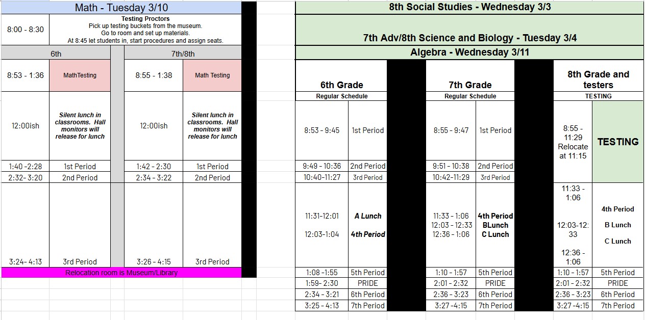 Monday 3/9- Character Education & PRIDE Prep Checklist Introduce the new PRIDE schedule Tuesday, 3/10- No PRIDE- Math Benchmark Testing Wednesday, 3/11- Go to 6th Period Class Math Waggle/Flex or Class Tutoring TBD by teacher Thursday, 3/12- Go to 7thPeriod Class Reading Waggle/Flex or Class Tutoring TBD by teacher Friday, 3/13- No PRIDE- Q3 Incentive Q3 Incentive Bell Schedule |