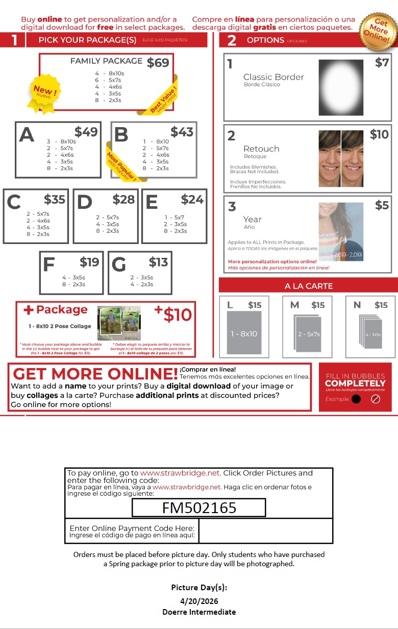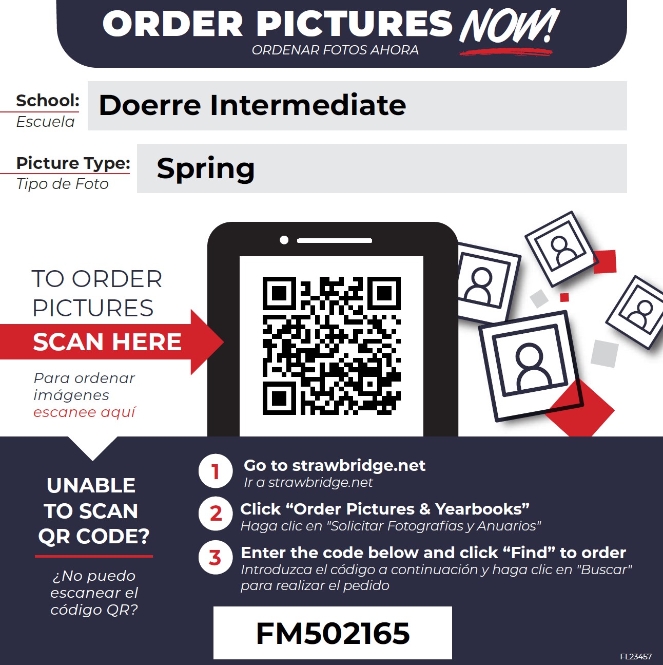 Klein ISD is no longer partnering with Lifetouch for picture retakes. As a result of some recent updates and adjustments in communication regarding this change, Doerre has scheduled an additional picture retake day with Strawbridge to ensure our students still have this opportunity. Spring Pictures will be by pre-order only and students who sign up will be called down from their classes to take their pictures throughout the day.