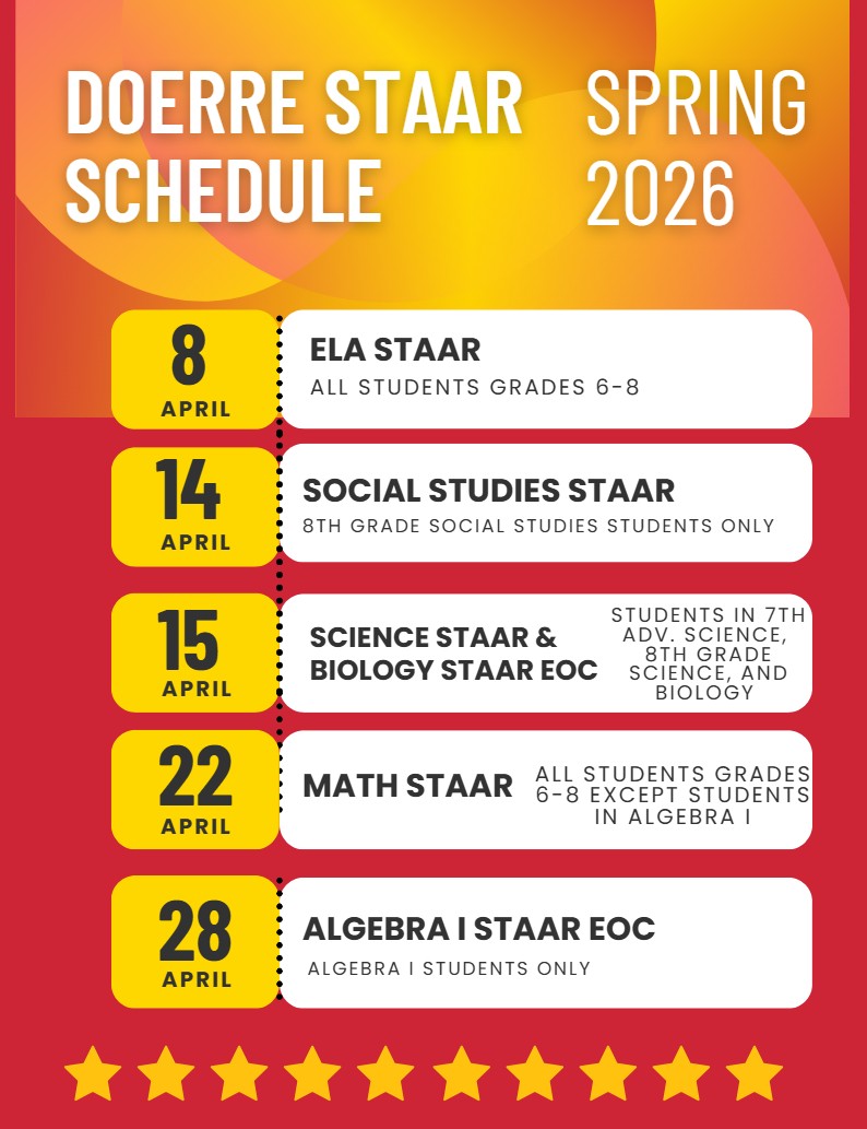 Beginning Monday, March 2, we will be shifting to a rotation-style PRIDE format during STAAR Prep Season. This adjustment will allow STAAR-tested teachers to see their classes at least two additional times (and in some cases three) prior to the Spring STAAR exam. This extra time will provide valuable opportunities for targeted review lessons, small group instruction, and focused skill practice.