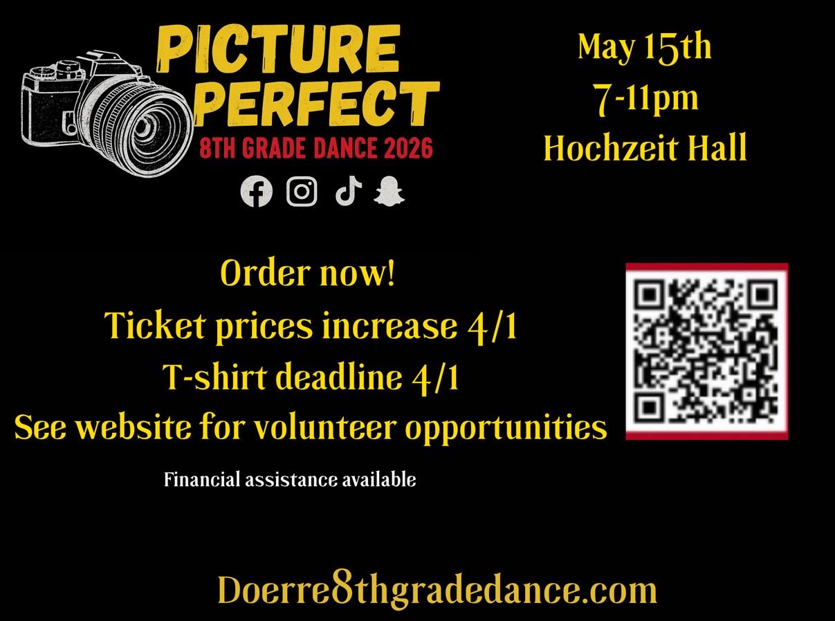 Each year, it is a Doerre tradition for a group of parents to host a community dance for all 8th Grade Doerre students! This is not a school sponsored event. However, all current Doerre 8th grade students are invited to attend. Any 8th grader wishing to attend the Doerre Dance on May 15th can find the information at the website below. For questions, please reach out to Ragan Garriot at txgarriott@gmail.com or Trish Drain at tdrain05@yahoo.com. |