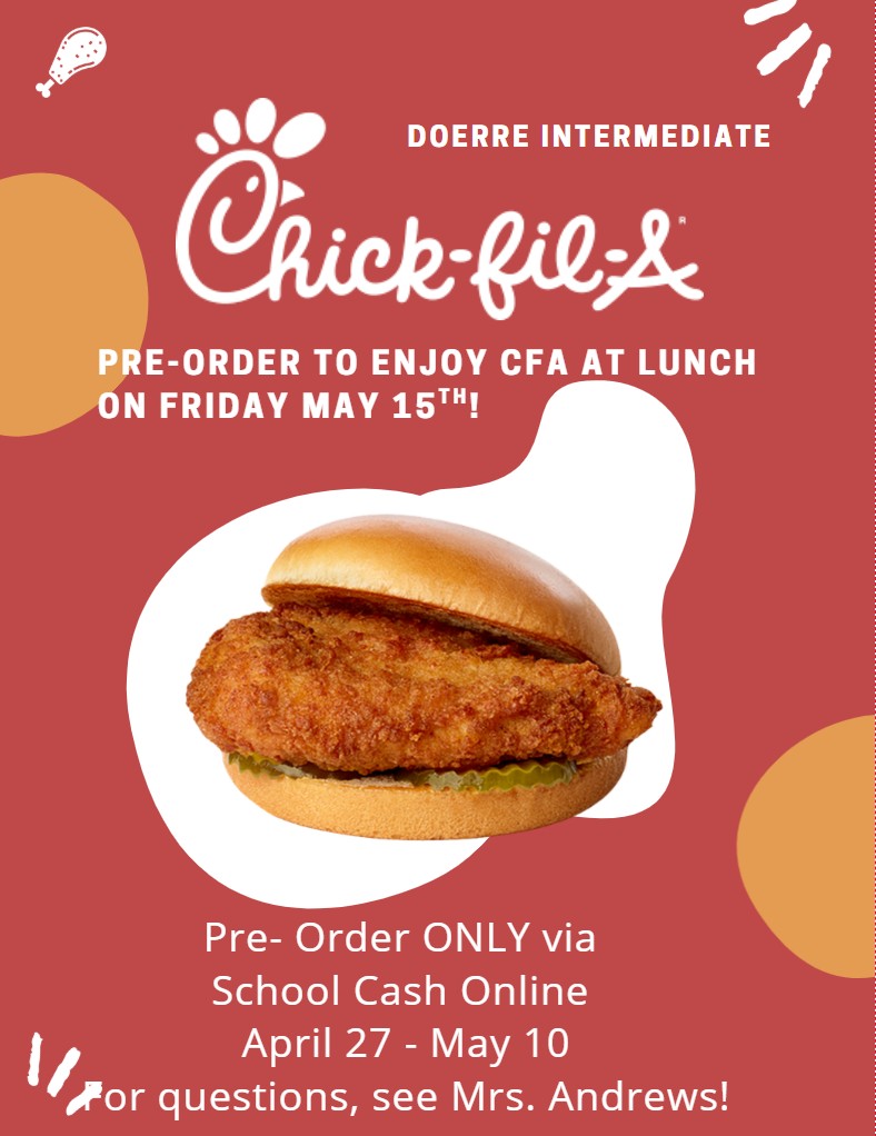 Beginning Monday, April 27, students may pre-order Chic-Fil-A to be eaten at our Fun Friday lunch on Friday, May 15th. This is a school fundraiser to help raise money and support all of the fun things we do at Doerre!
