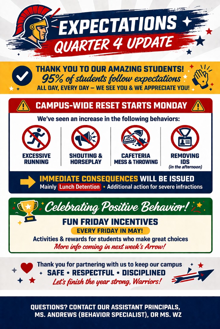 We are confident that, working together, we can maintain a safe, structured, and positive environment as we finish the year strong. If you have any questions, please feel free to reach out to one of our assistant principals, Ms. Andrews, our behavior specialist, or Ms. WZ directly.