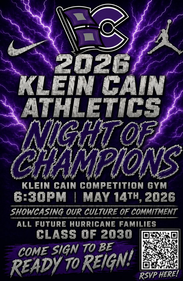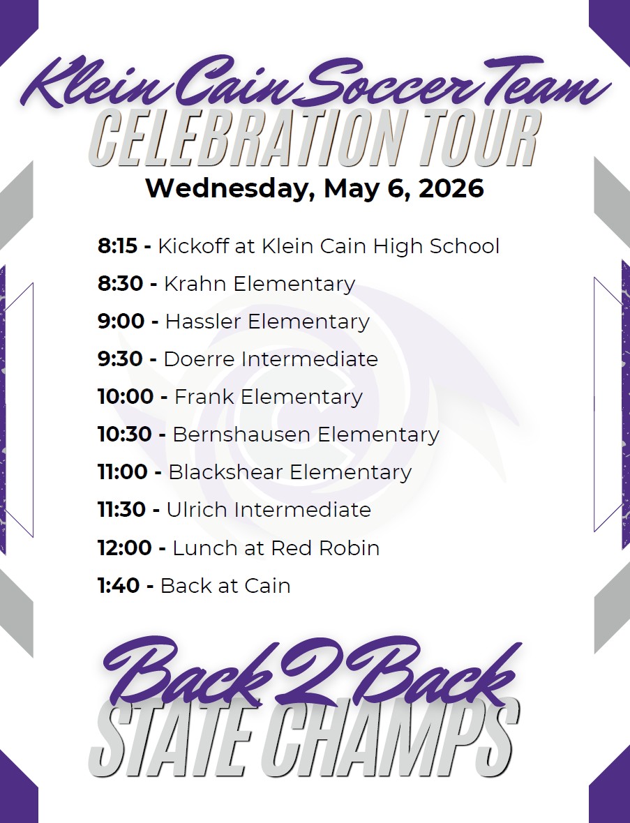 On Tuesday, May 6, we are excited to celebrate Klein Cain's 2nd Boy's State Soccer Championship with a walking parade! Our students will line the halls to celebrate our fellow hurricanes, and we would love the halls to be filled with PURPLE! See below for the Soccer Team's celebration tour schedule.