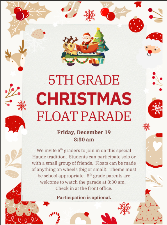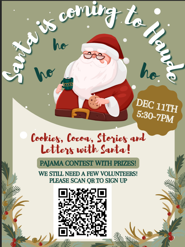 🎅🏼Santa is coming to Haude! Join us December 11th, 5:30-7PM for a cozy evening of holiday stories, cocoa, cookies, and Christmas cheer! Kids can write letters for Santa, enjoy storytime, enter the pajama contest, and soak in the holiday magic at this PTO-hosted event.