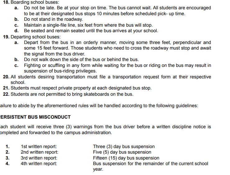 Please remind your students of the above bus conduct, more information is located in the student code of conduct linked below.