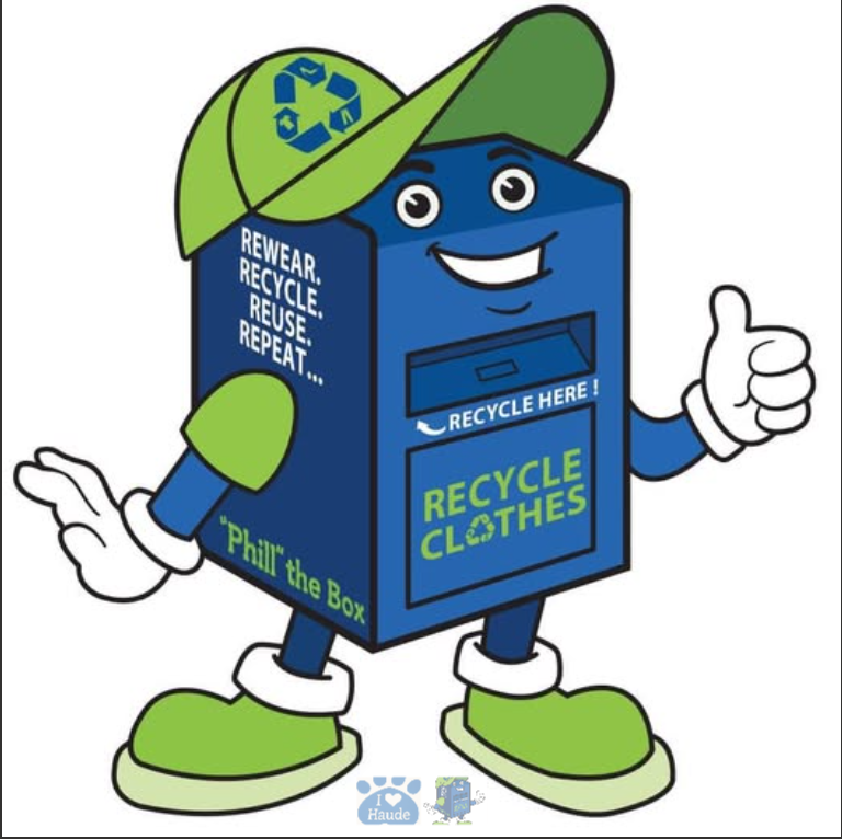 Phill the Box has arrived at Haude! You can drop off your gently used clothing, shoes, and accessories in the large metal boxes located in the Haude parking lot.