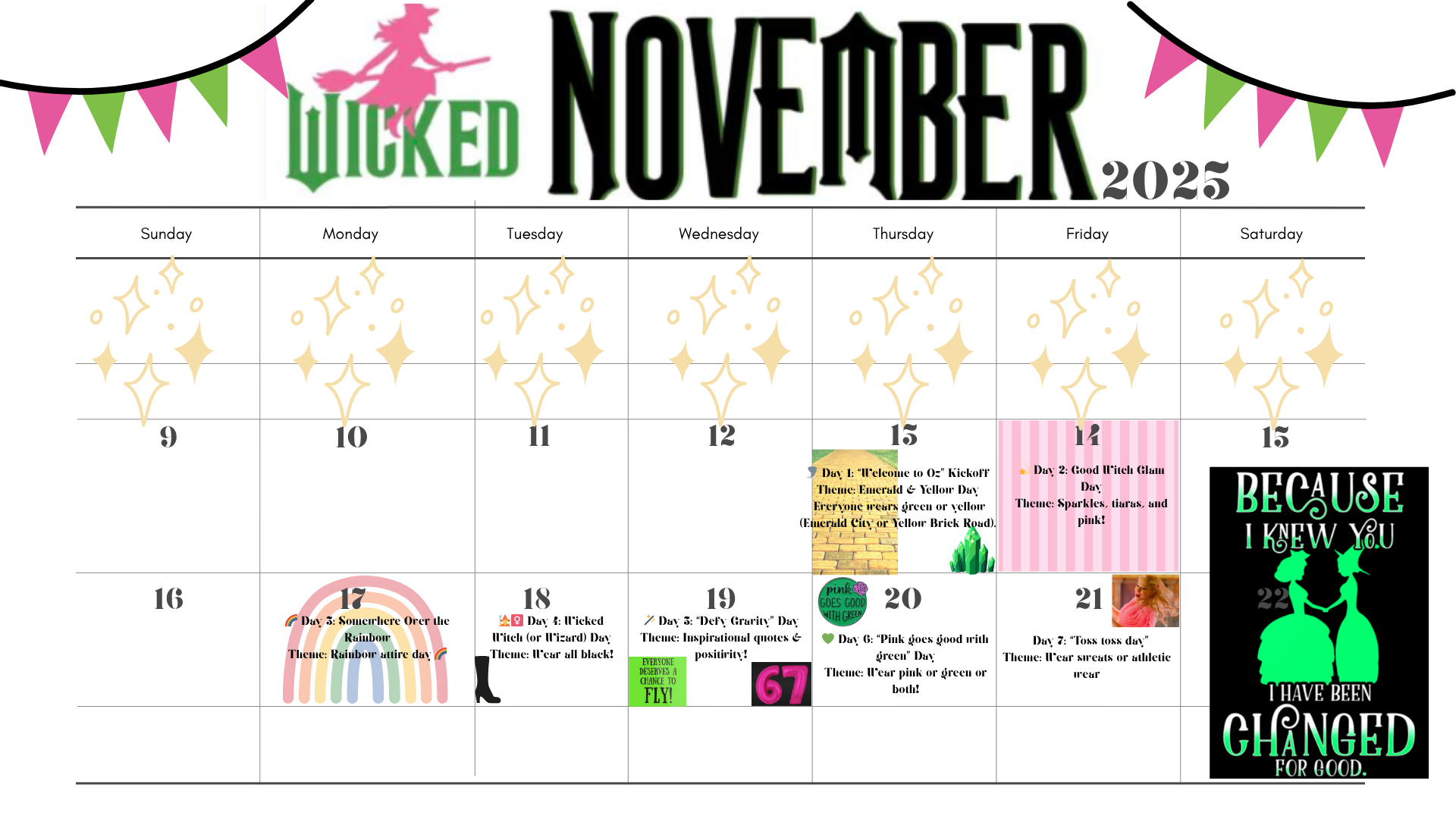 We’re kicking off the season with some Wickedly fun dress-up days, followed by festive holiday spirit! We can’t wait to see our students show their creativity and join in the fun. |