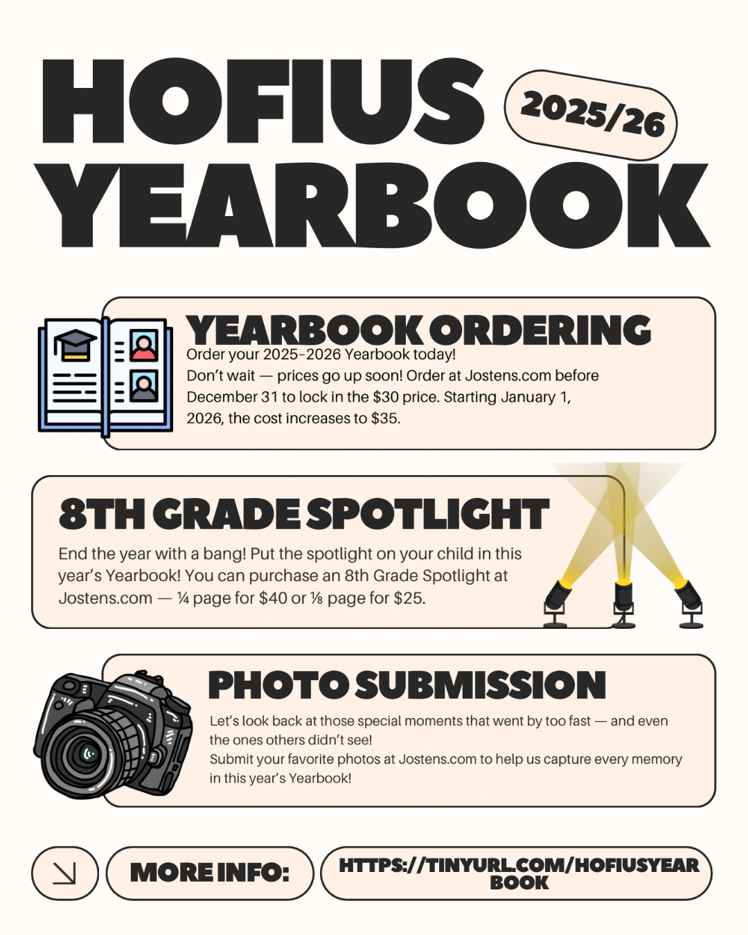 Our expectations is for our Hofius students to be in class on time and prepared and ready to learn! Students are tardy to class if they arrive after the tardy bell. Students are subject to disciplinary action for tardiness. If students arrive to class after 15 minutes, then the student is marked ABSENT and is subject to additional disciplinary action.