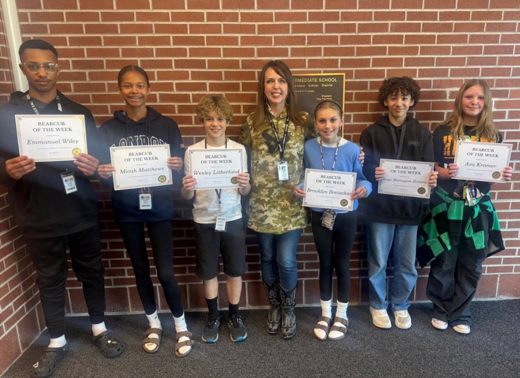 Brooklyn Bretscher - 6th Grade - Brooklyn exemplifies what it truly means to be a Bearcub! She consistently brings infectious positivity to the classroom with her bright smile and exceptional attitude. Brooklyn demonstrates remarkable integrity by always doing the right thing, even when no one is watching. Her respect for the learning environment and genuine kindness toward everyone around her make her a standout student who brightens every day.