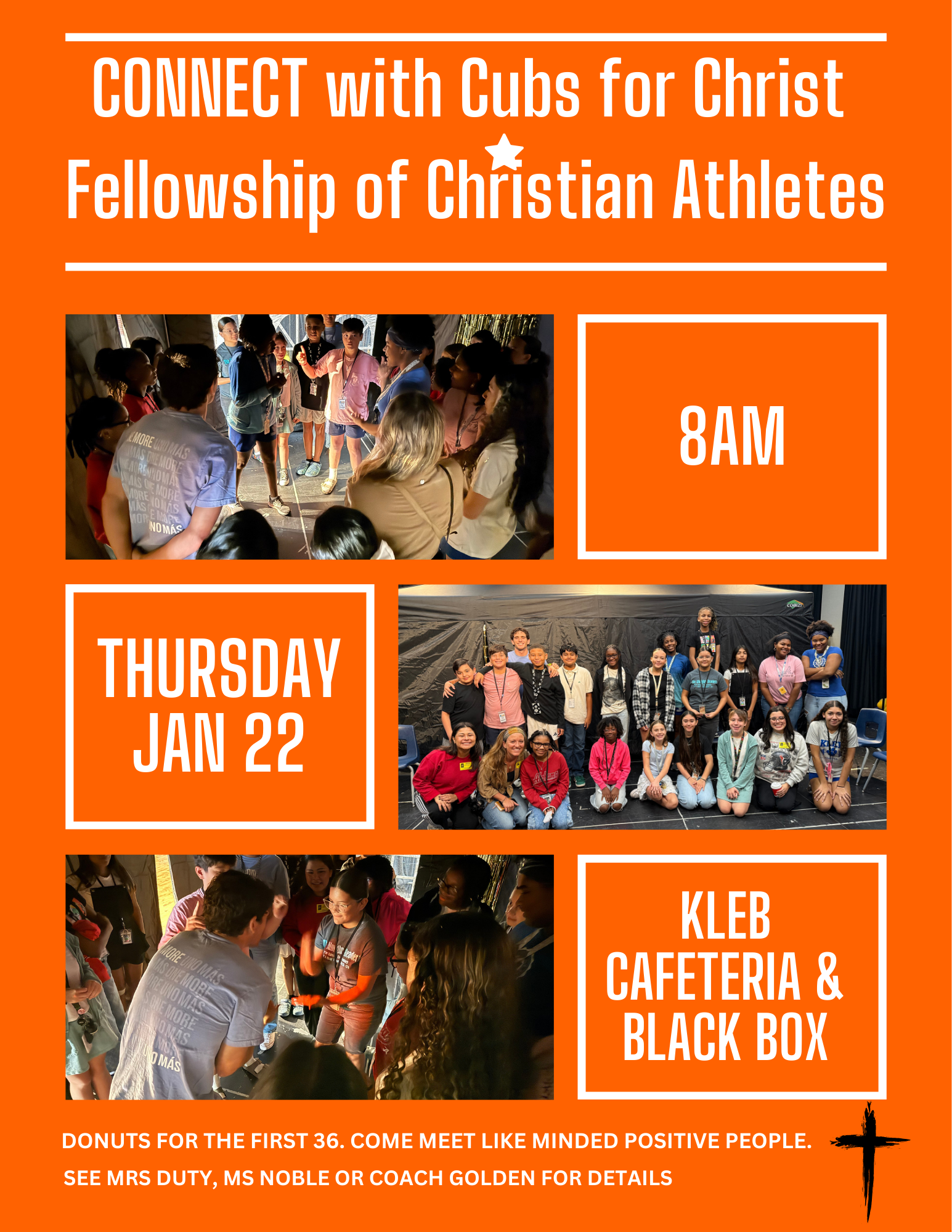 Connect with Cubs for Christ and Fellowship of Christian Athletes will meet this Thursday, January 22. Note: this date differs from the original calendar.) Students meet in the cafeteria at 8 am. Donuts for the first 36 students. Come be part of a positive group at Kleb — all are welcome! |