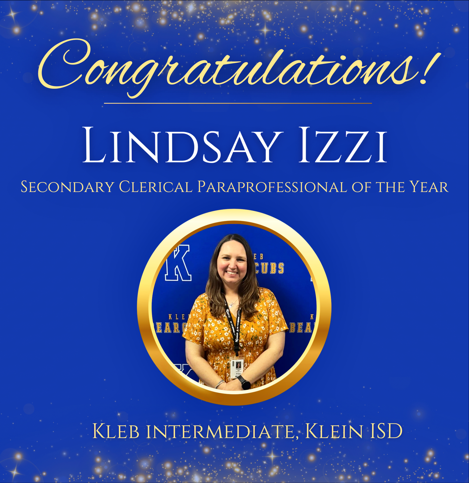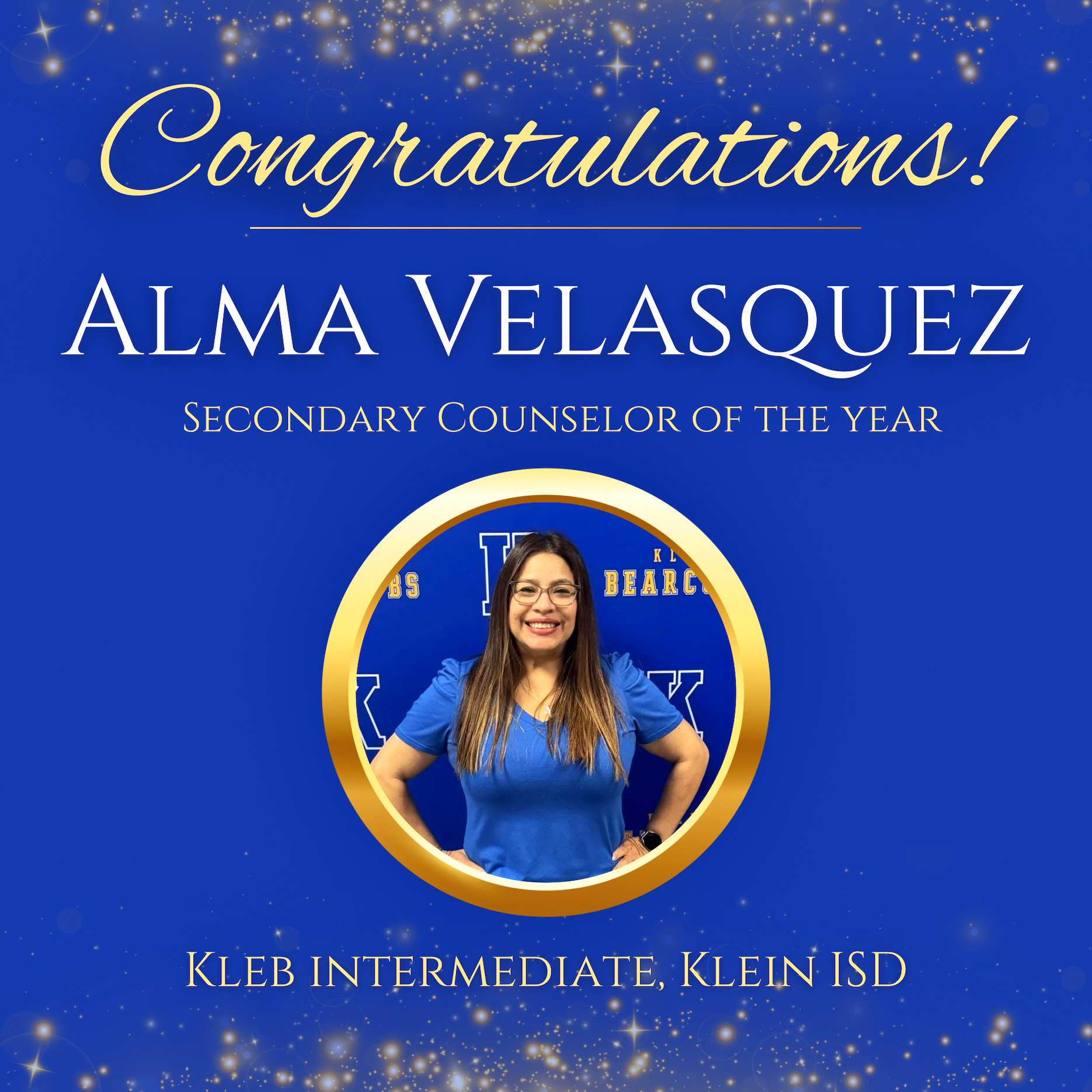 π Alma Velasquez - Klein ISD Secondary Counselor of the Year π Lindsay Izzi - Klein ISD Secondary Clerical Paraprofessional of the Year