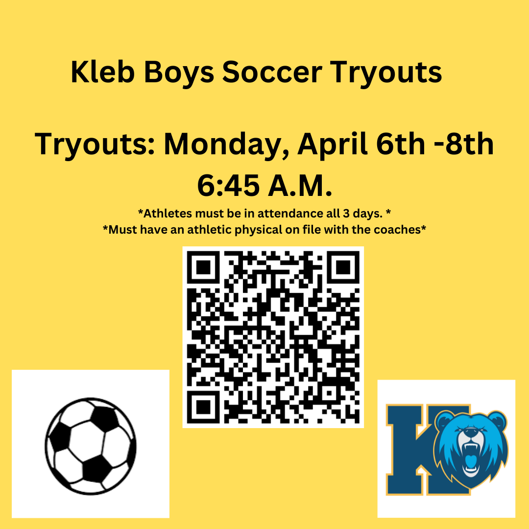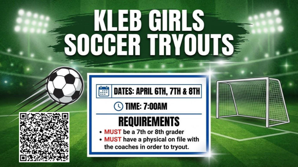 Don't miss this opportunity to be part of a Kleb Intermediate soccer team! Start preparing now and bring your A-game to tryouts. Both teams are looking for dedicated players ready to compete at their best. |
