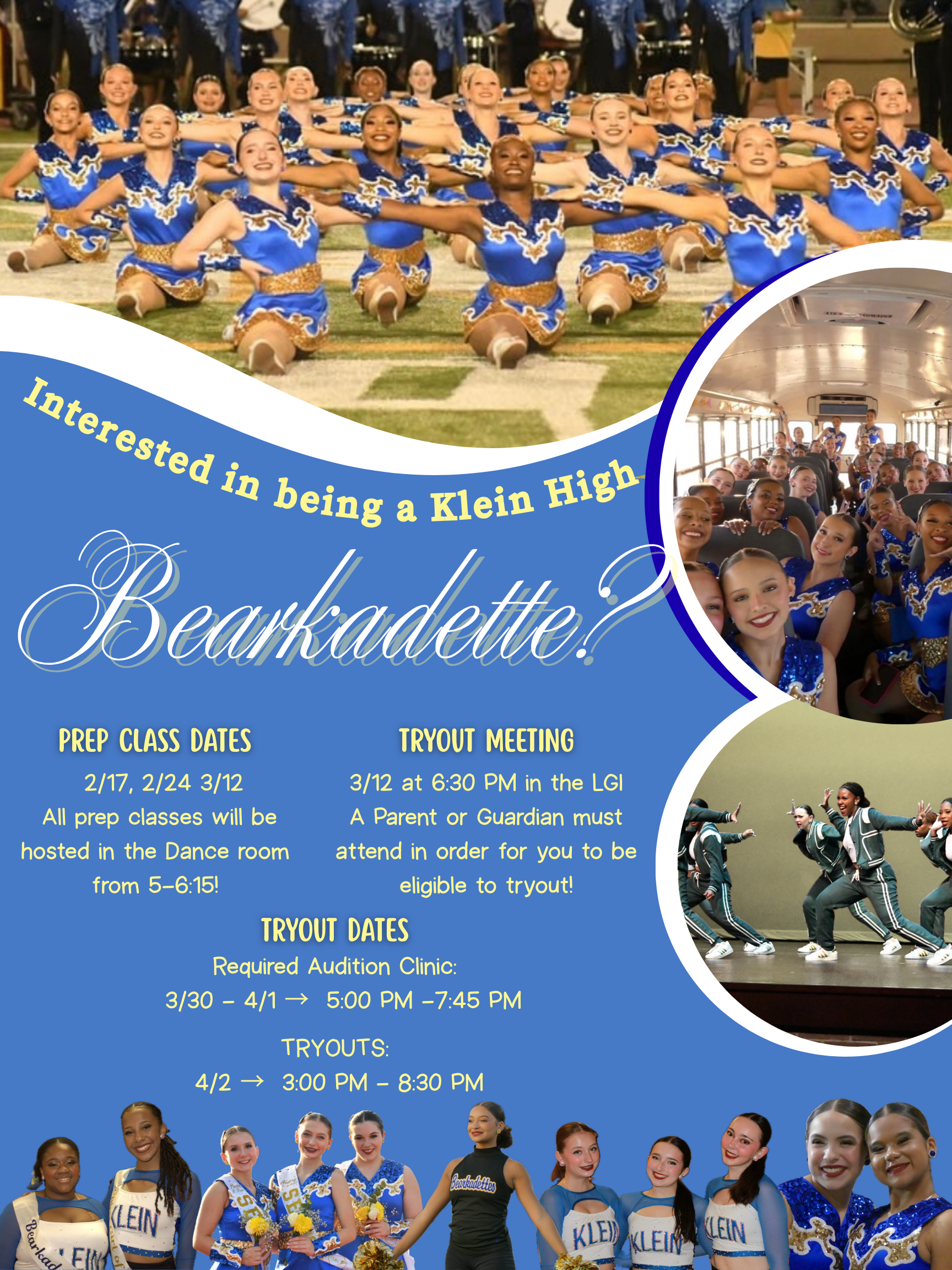 Calling all aspiring dancers! Are you interested in becoming a Klein High Bearkadette? Here's everything you need to know about the upcoming preparation and tryout process. π TRYOUT SCHEDULE: β’ Required Audition Clinic: March 30th - April 1st (5:00 PM - 7:45 PM) β’ Official Tryouts: April 2nd (3:00 PM - 8:30 PM)