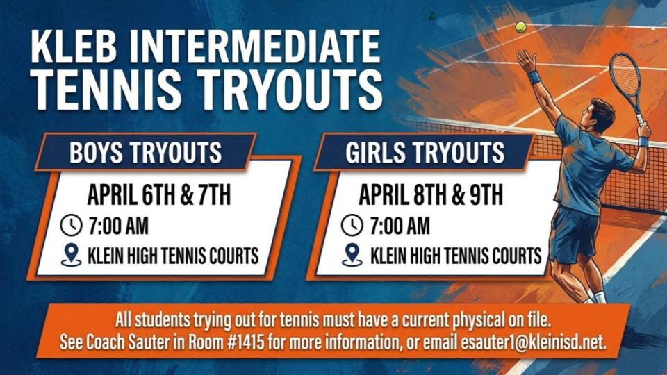 Ready to ace your way onto the Kleb Intermediate tennis team? Tryouts are coming up at Klein High Tennis Courts! π