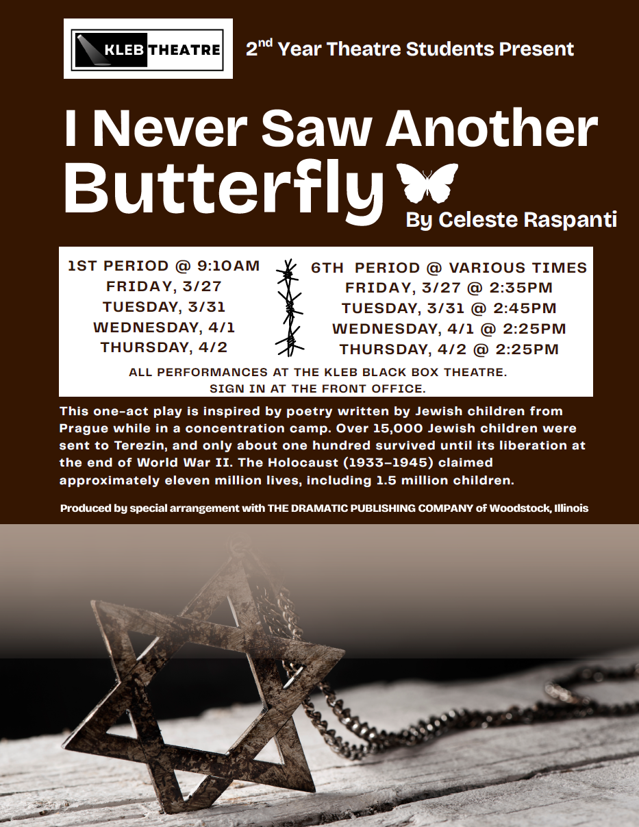 Our 2nd year theatre students will perform this powerful Holocaust remembrance play March 27th, 31st, April 1st & 2nd. Multiple showtimes available - see attached flyer for complete schedule and details. All performances in the Kleb Black Box Theatre.