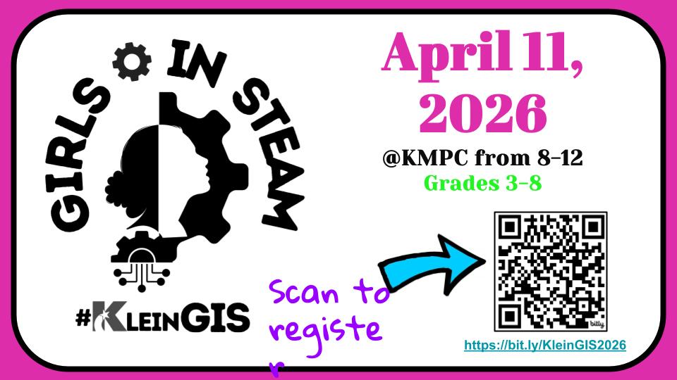 Join us for an exciting Girls in STEAM event on April 11, 2026 from 8:00 AM - 12:00 PM at the Klein Multipurpose Center (7500 Farm to Market 2920, Klein, TX 77379).