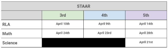 Please see the image below for all STAAR testing dates for this school year. |