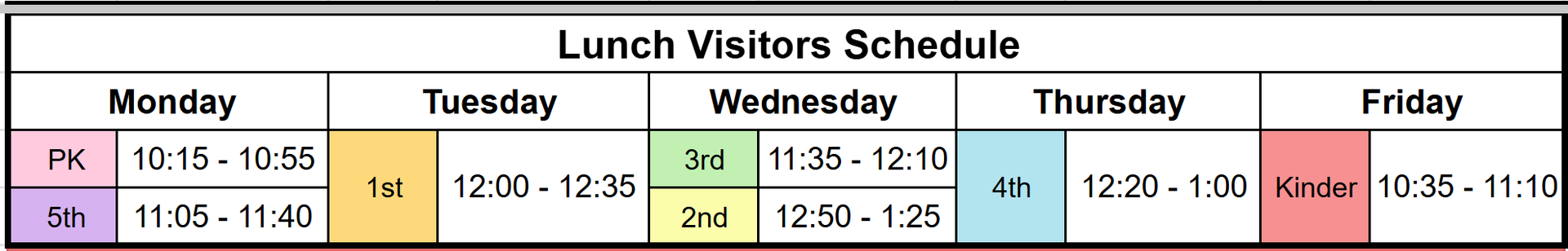 **You may only have lunch with your student on their designated day. If you would like to have lunch with your child on their birthday that falls on a day outside of the designated grade level day, please contact the grade level assistant principal for approval. |