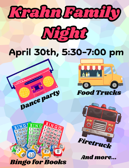 We hope you will join us for a fun night that has something for the whole family! We will have food/snacks for purchase and activities in the carpool parking lot by the cafeteria, live BINGO in the library, a dance party in the cafeteria, as well as tables for people to eat.