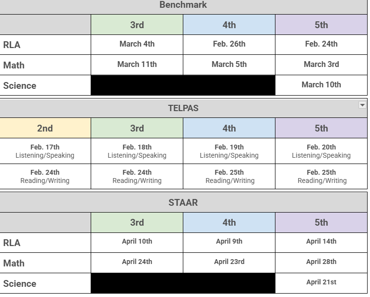 Please see the image below for all TELPAS, Benchmark, and STAAR testing dates for this school year. |