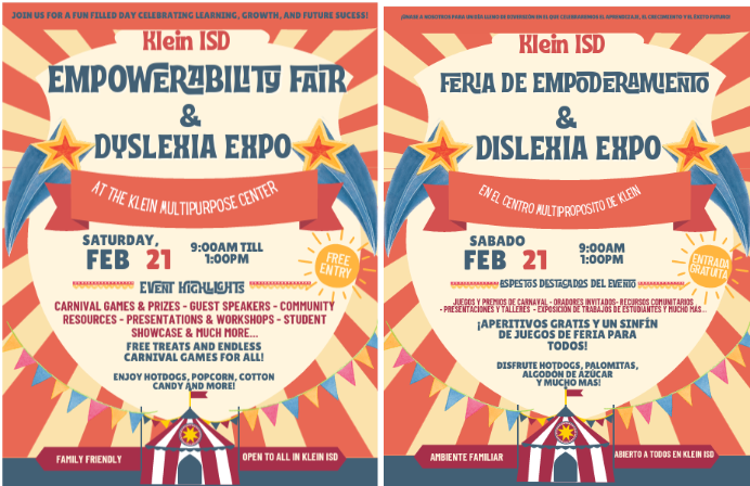 SAVE THE DATE for Klein ISD’s Empowerability Fair & Dyslexia Expo on Saturday, February 21st from 9am-1pm at Klein’s Multipurpose Center. It’s a free event and all are welcome! Krahn’s dyslexia teacher, Mrs. Muddiman will be there that morning and some Krahn students will be participating in the student showcase portion of the event from 10am–12pm. Come show your support and have a great time! We hope to see you there! |