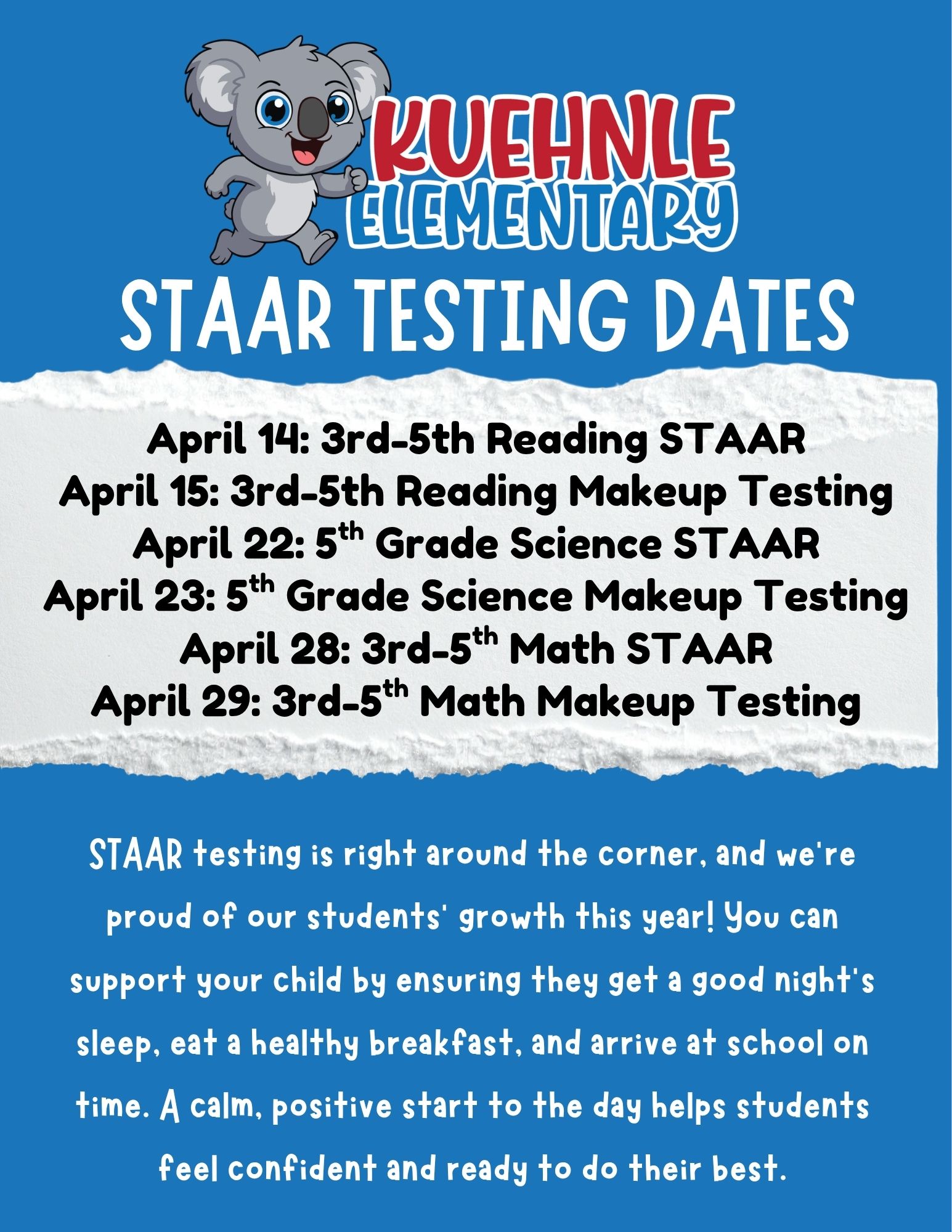 STAAR Testing Dates (3rd–5th Grade): April 14 – Reading April 22 – Science (5th Grade Only) April 28 – Math
