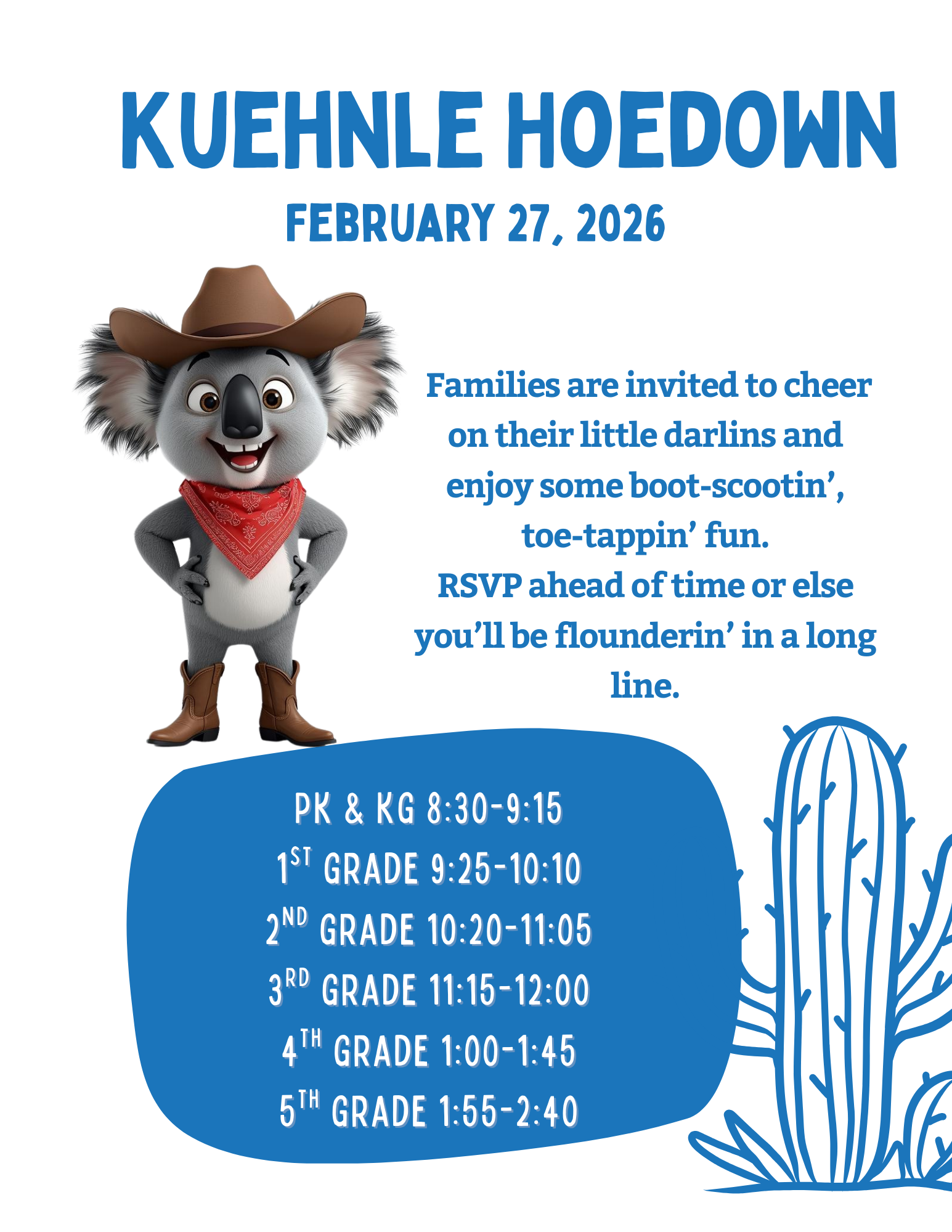 Howdy, Cowgirls and Cowboys! The Kuehnle Hoedown is Friday, February 27th. Parents/guardians are welcome to watch your little darlins' have a boot scootin', toe tappin', good time. Please plan ahead by RSVPing to the event by noon on Monday, February 23rd. Dress in your best western duds but leave your spurs and toy guns back at the ranch! Hoedown Visitor Information Badge Pickup: Visitors who RSVP’d can pick up their badges at the tables outside the front office. If you did not RSVP, please arrive early as you may have to wait in line to get your badge. We don’t want you to miss the Hoedown! After receiving your badge, please wait in the designated area near the gym. During the Hoedown: You will be directed into the gym when it’s time for your grade level to perform. Please remain on the red painted portion of the gym floor upon entering. You do not need to ‘check out’ when you leave unless you are doing an early dismissal.