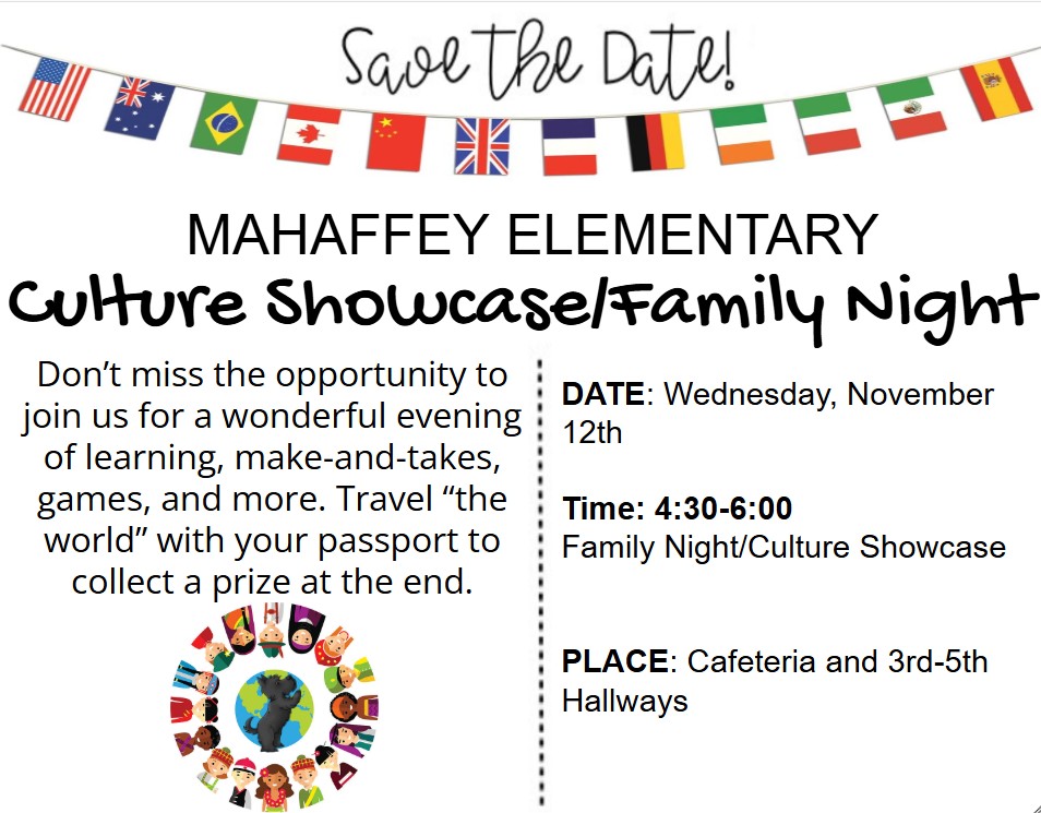 11/14: Chick-Fil-A Lunch ordering for students: https://skoolbites.app/order/mahaffey-elementary 11/20: Painting with a Twist Spirit night in the Cafeteria (5:30-7:30pm)