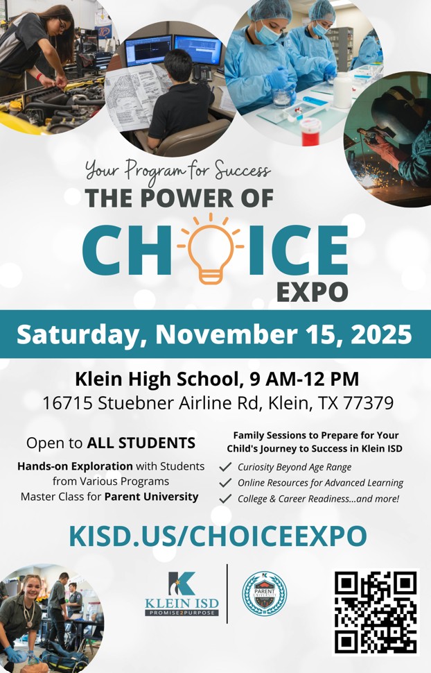The Power of Choice event will take place on Saturday, November 15, at Klein High School. This is an event to encourage College & Career preparation, and it is open to families in all grade levels! Please see the important details below: