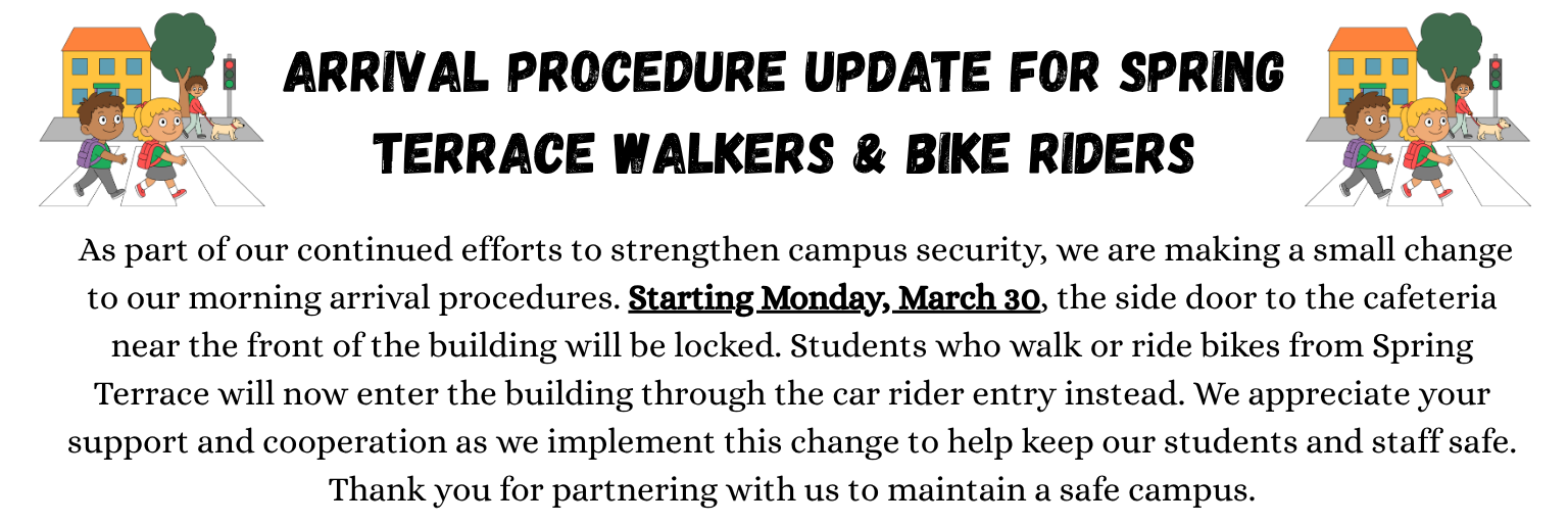 If your student is PK thru 2nd Grade please make sure there is a parent at the end of our Walker/Biker line to receive the student. It is unsafe for them to walk through the neighborhood alone. If no one is there, we will return the student to the front office until a guardian arrives. Thank you!