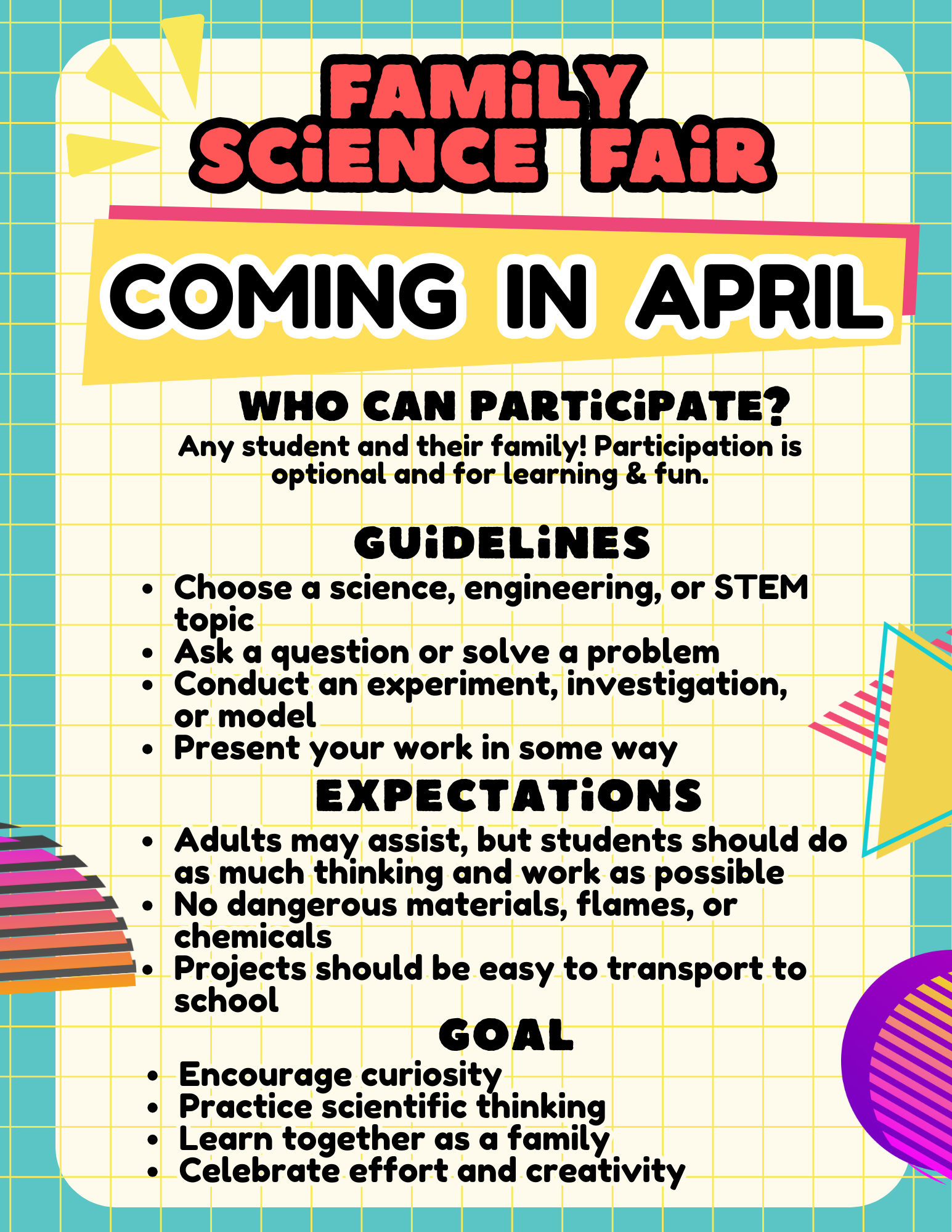 Any student and their family can join the fun! Pick a science, engineering, or STEM topic, ask a question or solve a problem, conduct an experiment or build a model, and present your work. Adults may assist, but students should do most of the thinking and work. No flames or dangerous materials; projects should be easy to transport. Celebrate curiosity, scientific thinking, and family learning together! 🔬🤖🌟 |