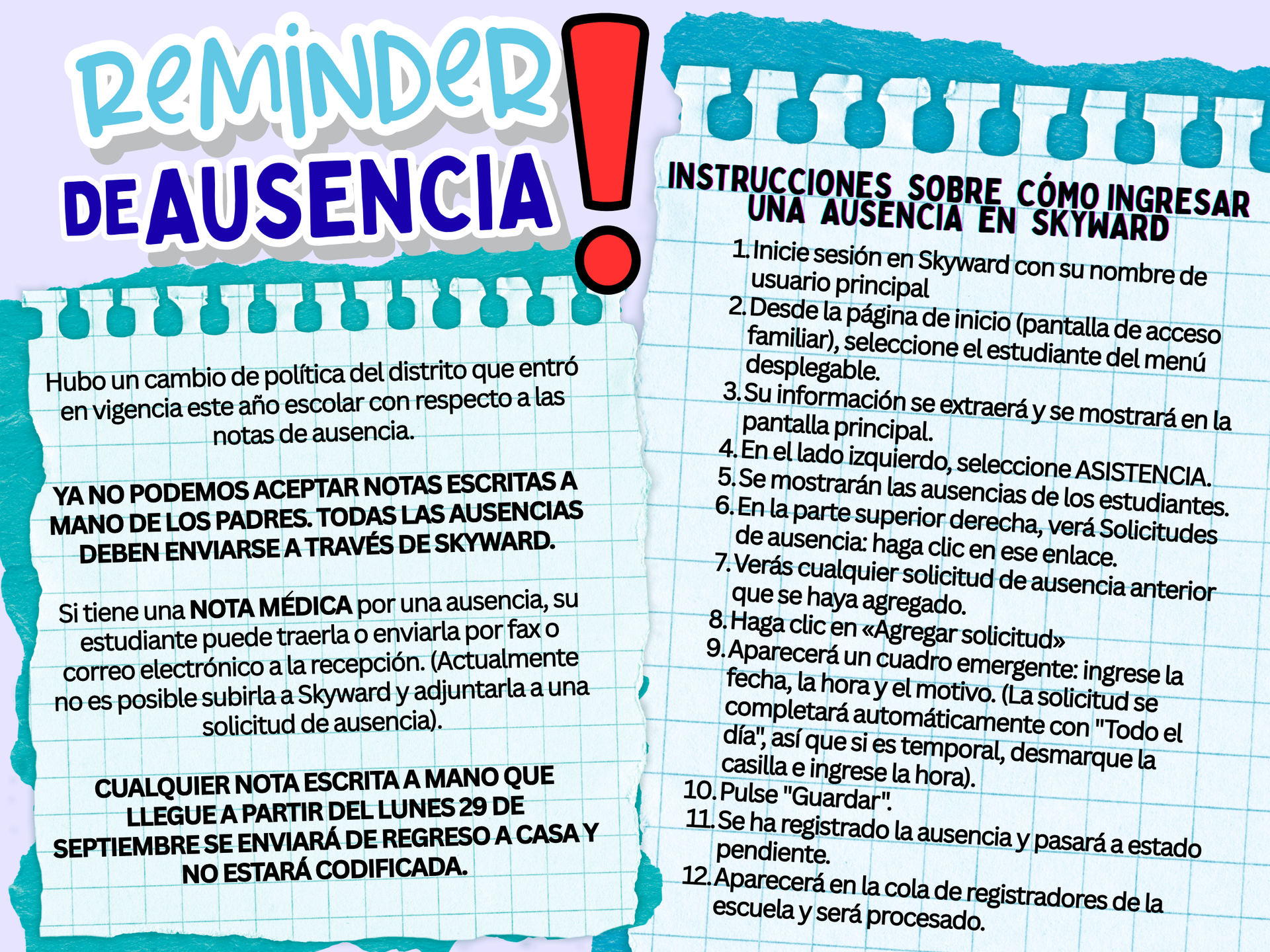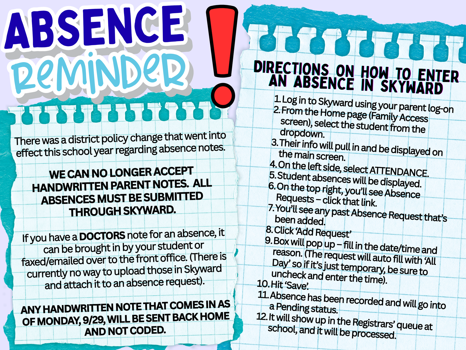 Attendance matters because every day in school is an opportunity to learn, grow, and build connections. When students are present, they gain essential skills, keep up with lessons, and stay on track academically. Consistent attendance also helps students develop responsibility, routines, and a sense of community with classmates and teachers. Even a few missed days can make it harder to keep up, so being at school every day ensures students don’t miss out on learning, friendships, and all the experiences that make school meaningful. If you are unable to make it to school, please see the directions for uploading your absence into Skyward so it is properly recorded.