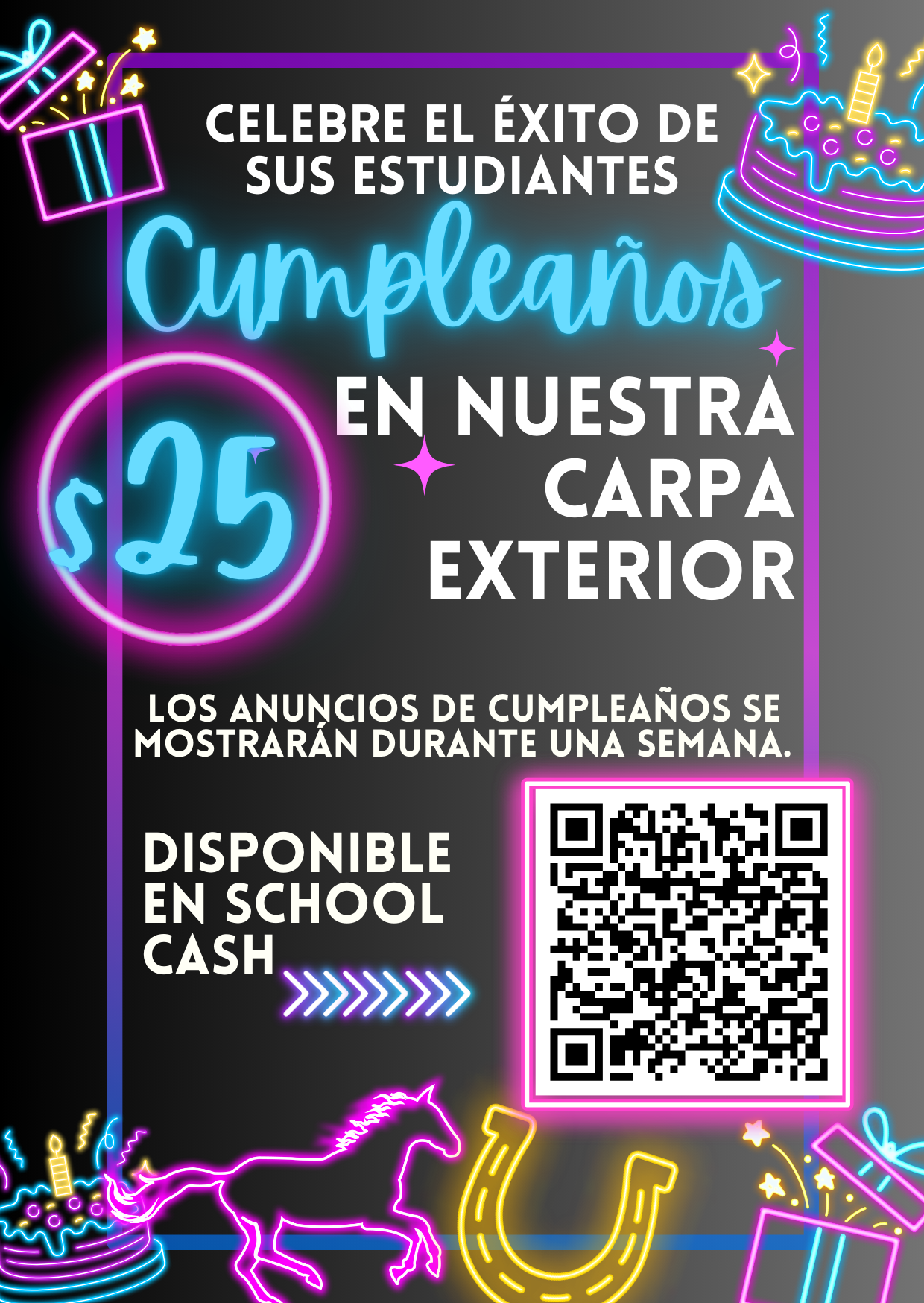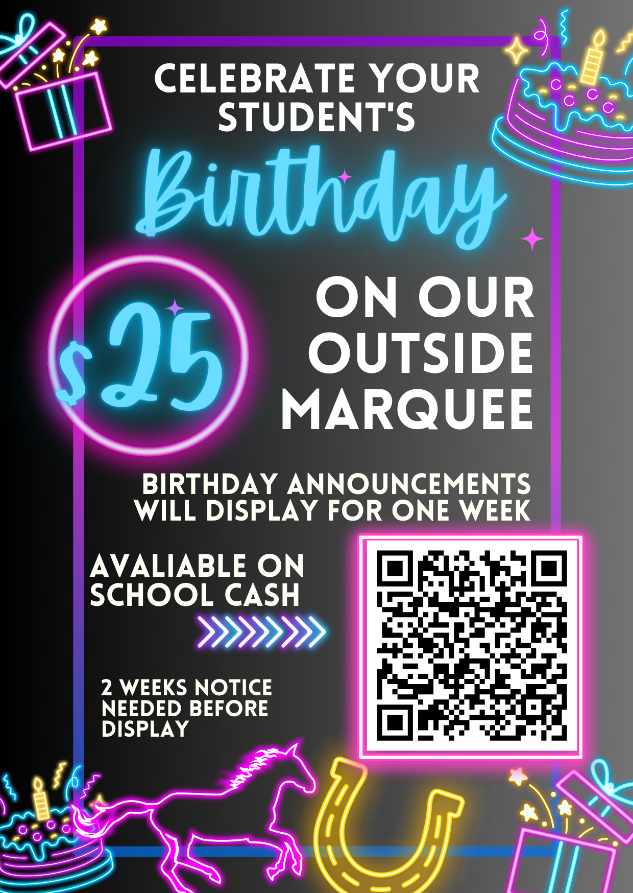 Celebrate your student on our outdoor marquee! For $25, we’ll display a birthday announcement for one week. Announcements are available through School Cash and require at least two weeks’ notice. Give your child a neon‑bright moment to shine—perfect for making their day extra special! |