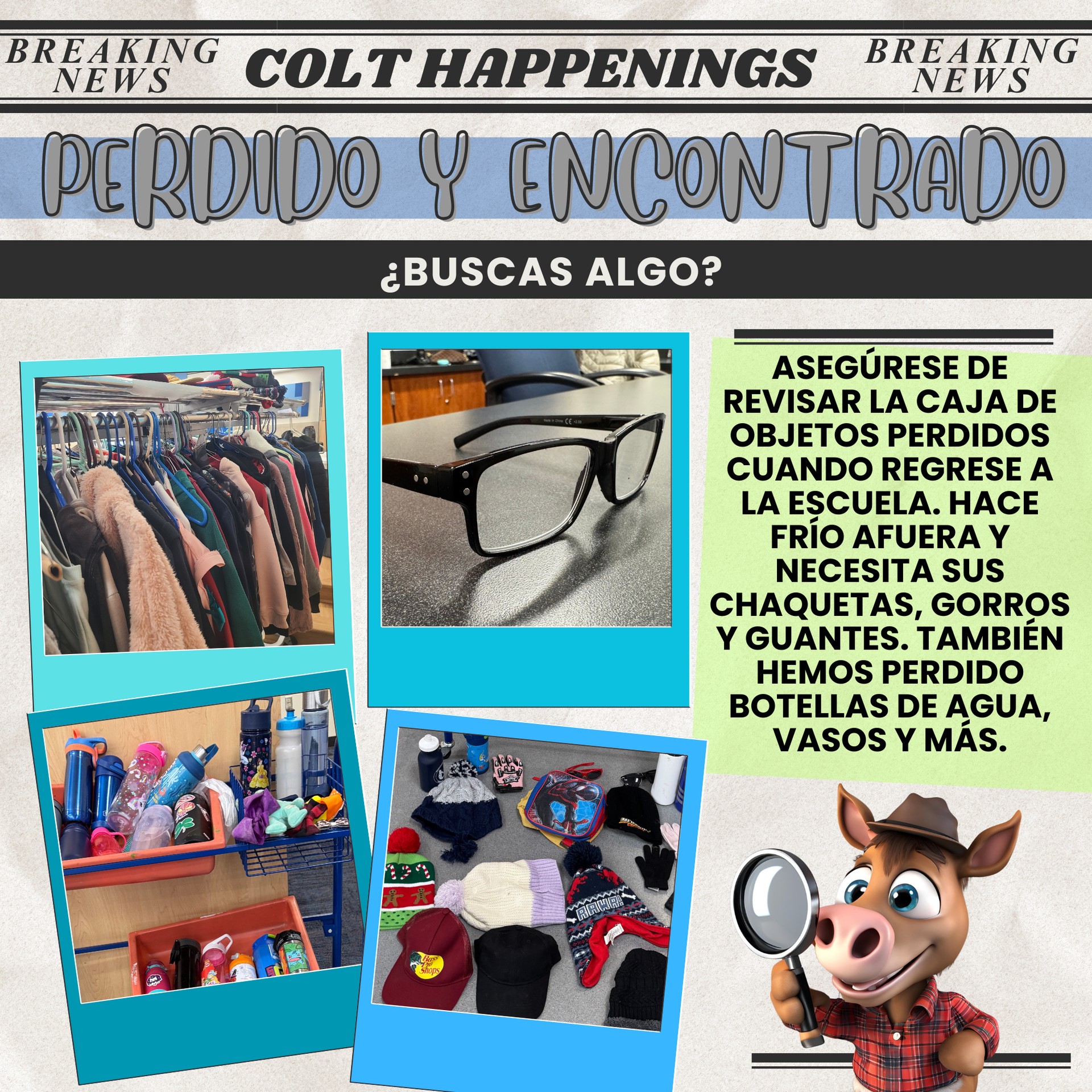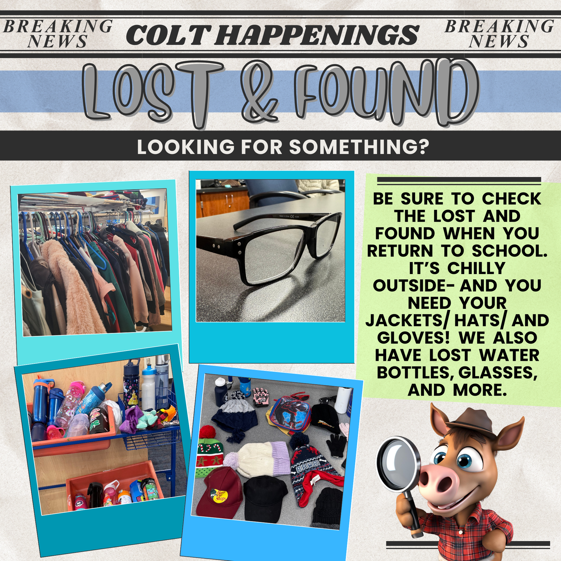 Our Lost & Found is overflowing with jackets, hats, gloves, water bottles, glasses, and more. With colder weather here, please remind your child to check for missing outerwear and personal items when they return to school. Encourage students to label belongings and to stop by the Lost & Found soon — items not claimed after a reasonable time will be donated. Thank you for helping us keep students warm and prepared! |