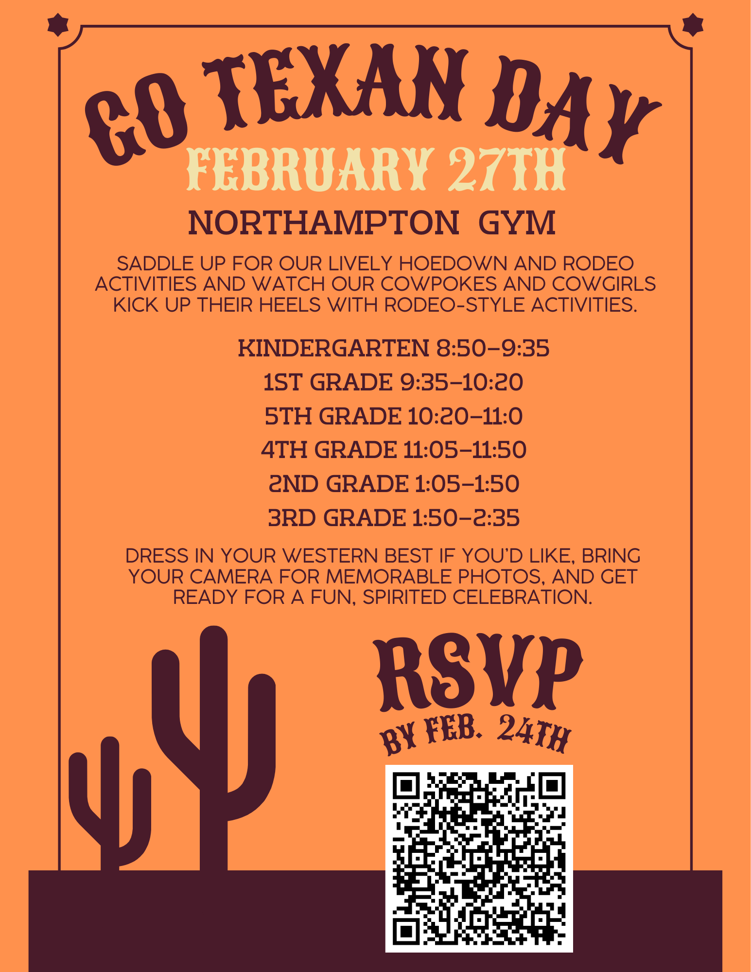 Why it’s so cool: this cozy morning blends sweet treats and warm conversation, gives students a chance to celebrate family and community, and makes Go Texans Day extra festive with proud school spirit — plus, who doesn’t love donuts and a photo-ready outfit? 📸🎉 When: Feb 27 Time: 7:30 AM We can’t wait to see y’all there — it’s going to be a rootin’-tootin’ good time! 🎉🐴 |