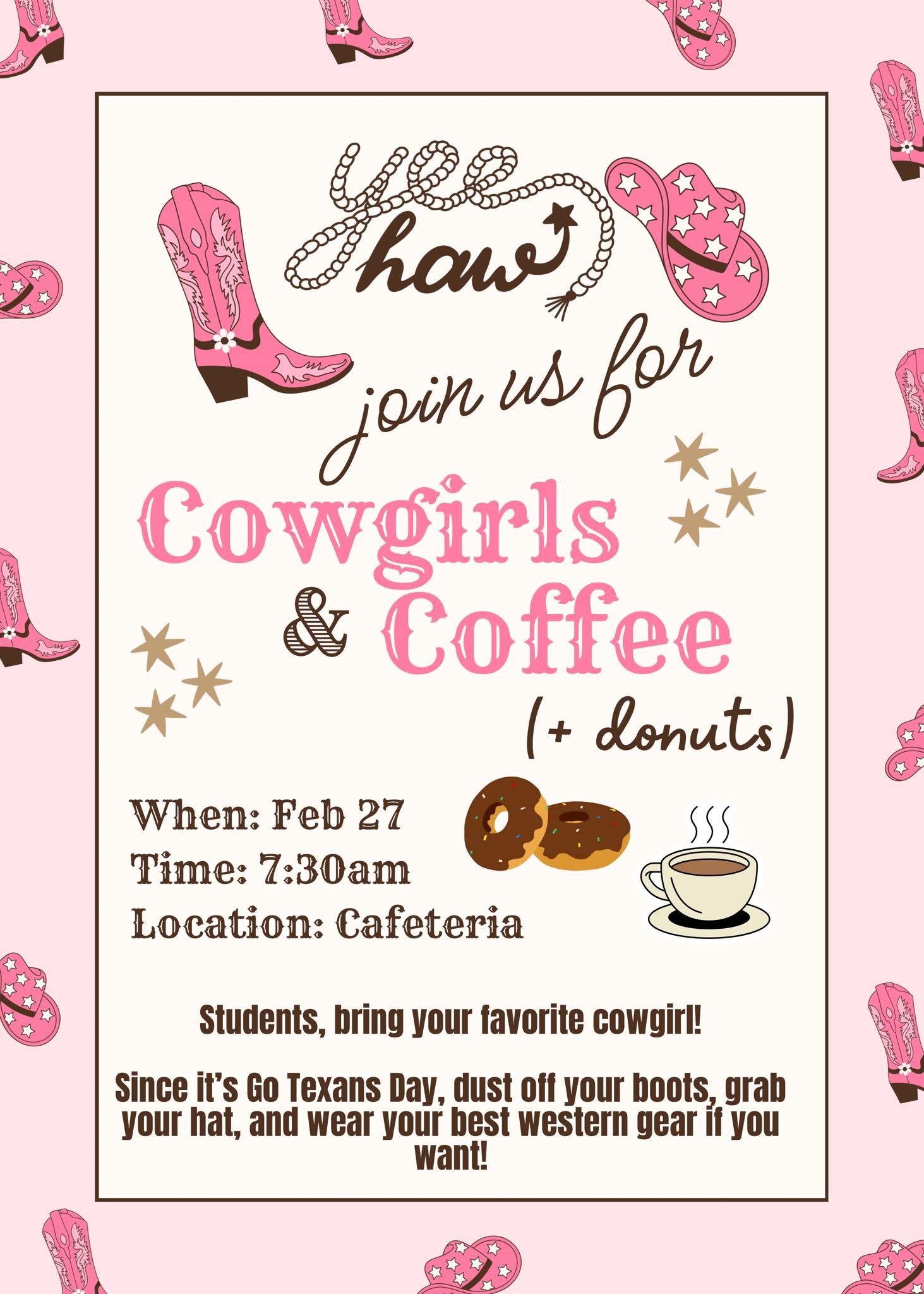 Join us for Cowgirls & Coffee on Feb 27 at 7:30 AM in the cafeteria. Students are invited to bring their favorite cowgirl for coffee, conversation, and donuts. Since it's Go Texans Day, feel free to dust off your boots, grab your hat, and wear your best western gear! 🤠👢👒