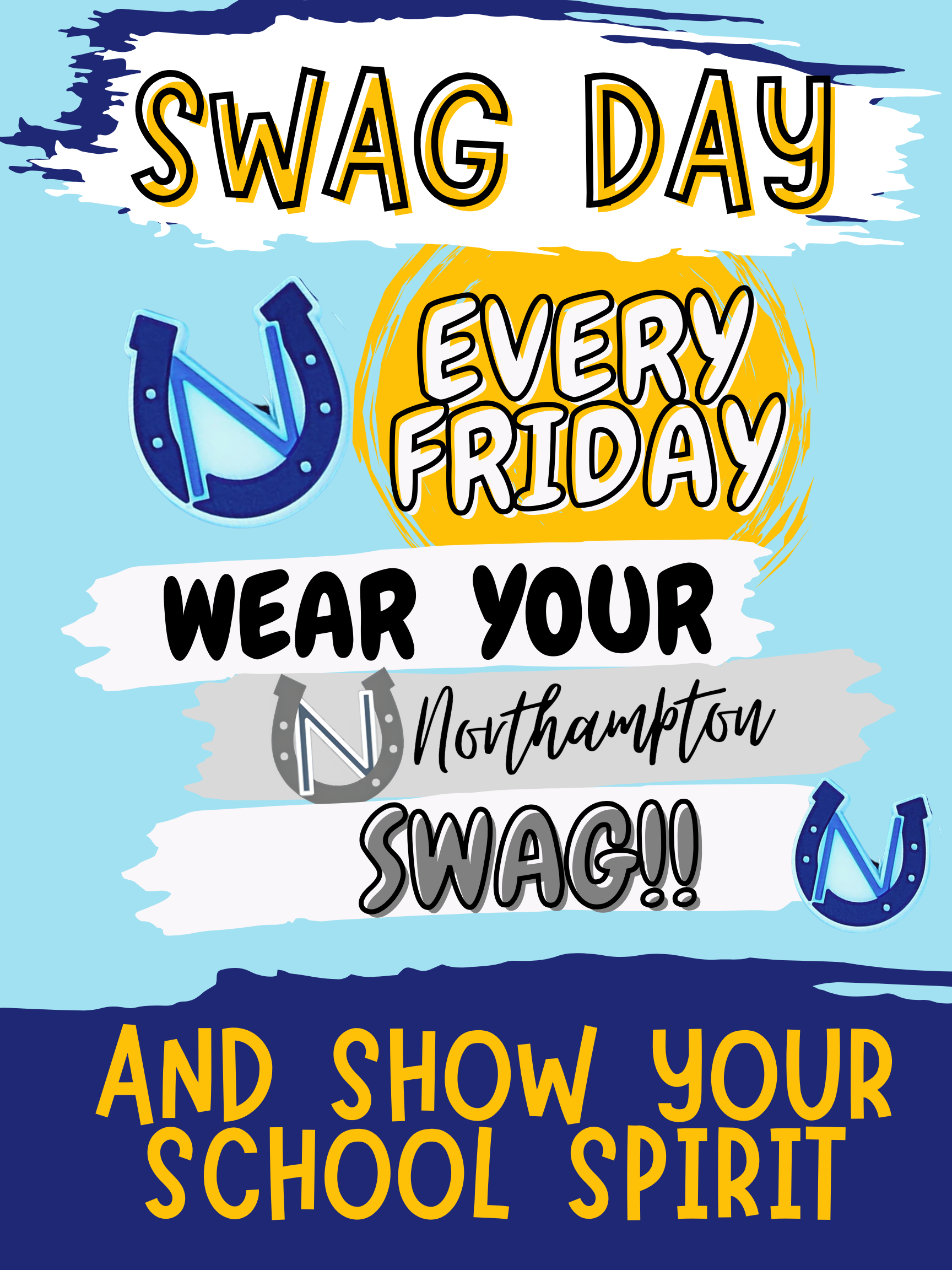 Friday = Swag Day! Wear your Northampton gear every Friday to show your school spirit—tees, hoodies, hats, or anything with our horseshoe "N." It’s the perfect way to celebrate our school pride, connect with friends, and make the hallways pop with blue and gold. Tip: Label your swag so it doesn't end up in Lost & Found. See you repping Northampton! Swag Day Poem — Short & Sweet Swag on Friday, colors bright, Horseshoe "N"—wear it with pride. Tees and hoodies, caps held high, Blue and gold beneath our sky. Snap a smile, share a cheer, Friends together, spirit near. Label your things—keep them found; Swag Day brings our hearts around.