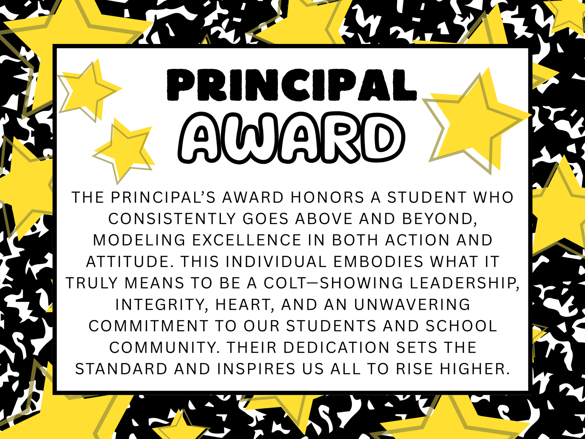 We’re thrilled to celebrate the Principal’s Award — an honor given to a student who consistently goes above and beyond with leadership, integrity, and heart. This recognition spotlights a Colt who models excellence in both action and attitude, inspires classmates, and raises the bar for our whole school community.