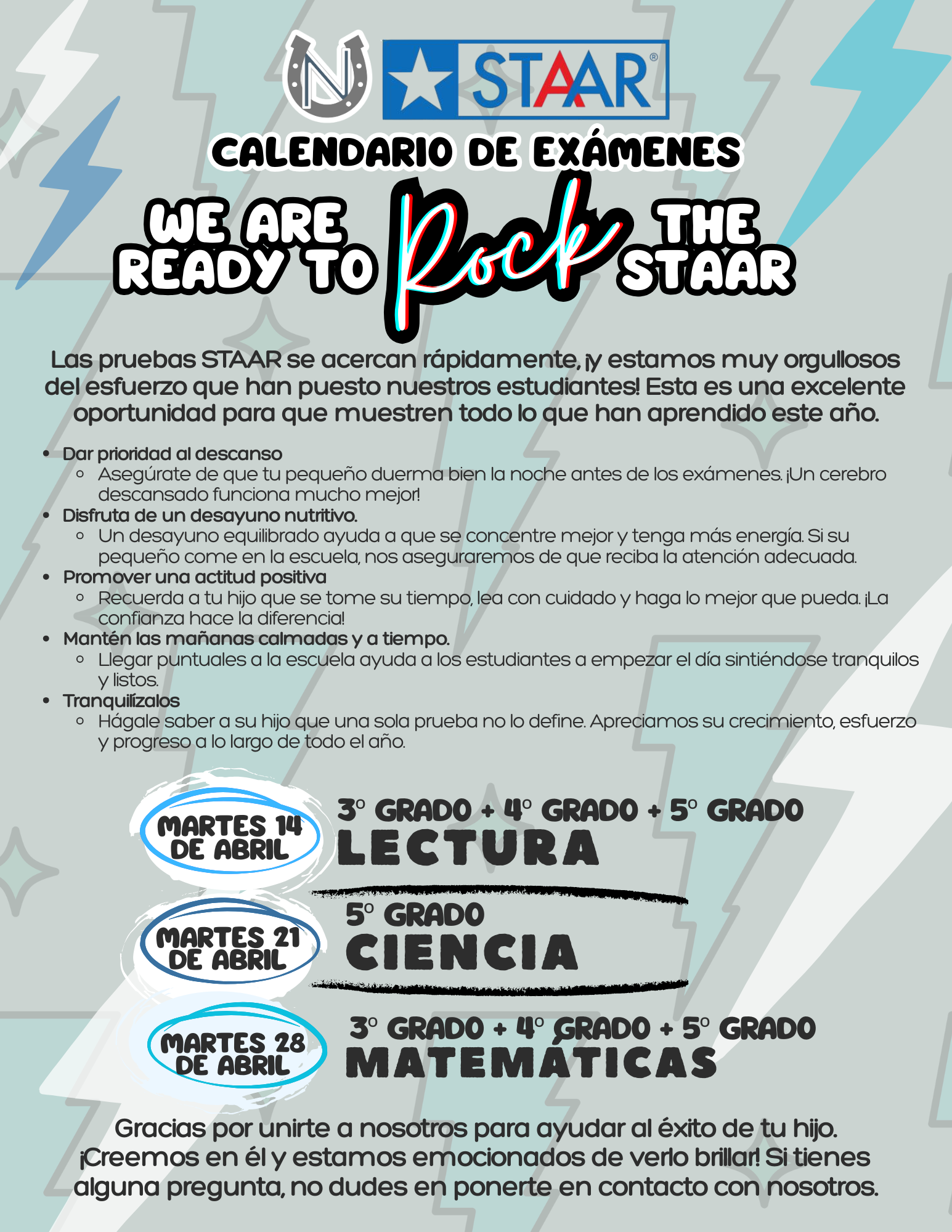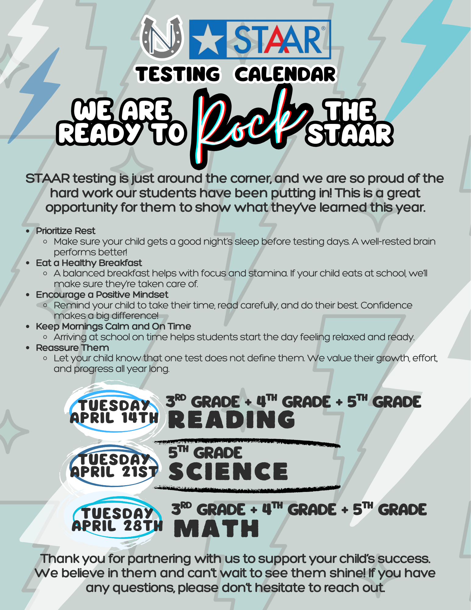 STAAR testing is coming soon and we’re proud of the progress our students have made this year. As the dates approach, please support your child by encouraging a good night’s sleep, a healthy breakfast, and calm, on-time mornings. A positive, reassuring attitude at home helps students feel confident and focused—remind them that effort and growth matter more than a single score.