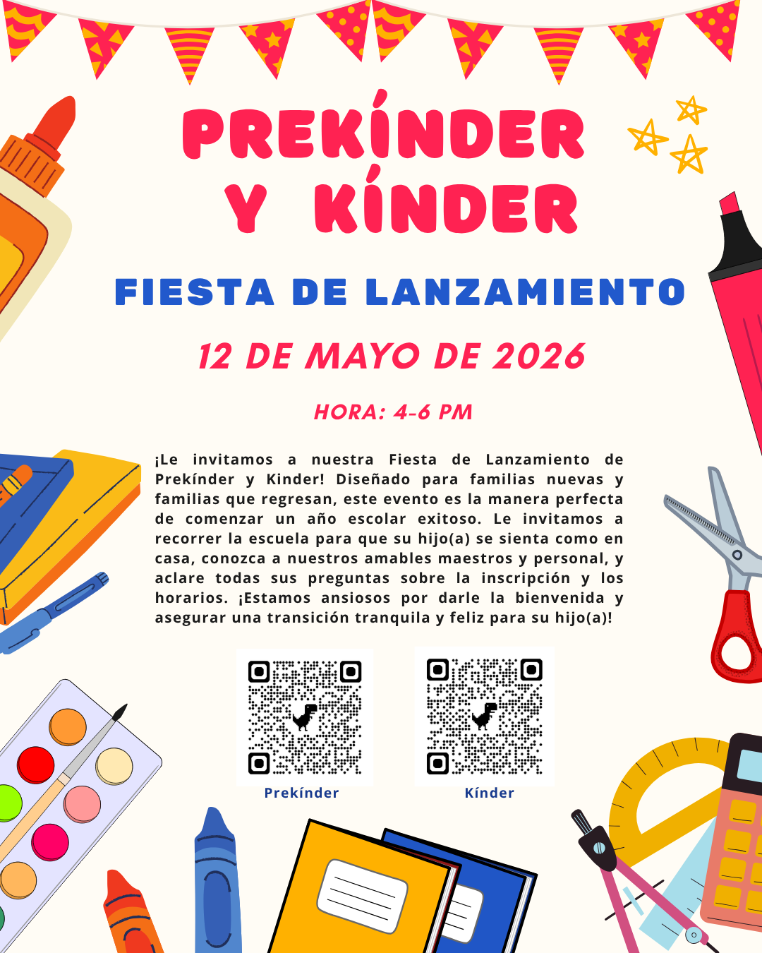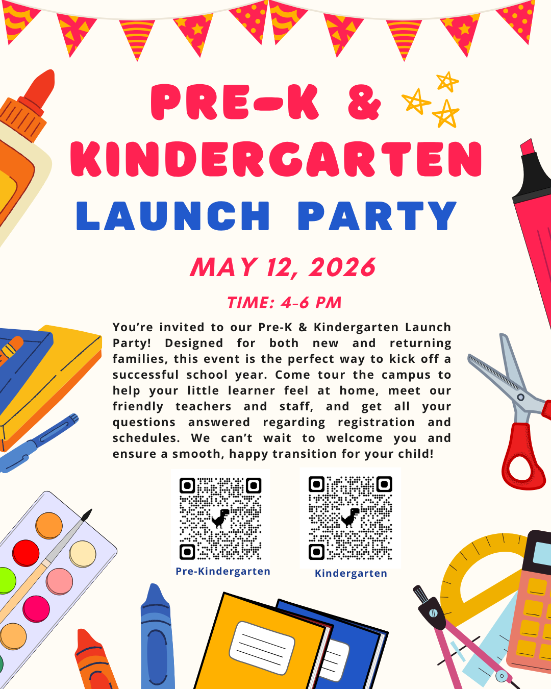 5/12 Prek and Kinder Launch Party, 4-6 pm, Roth Cafeteria